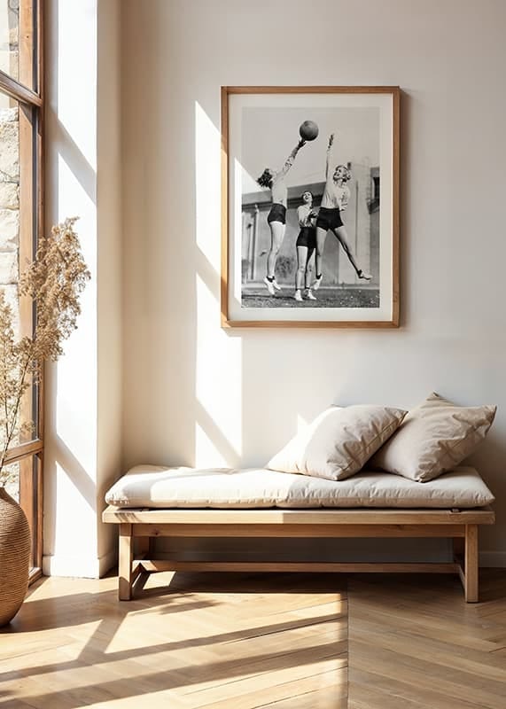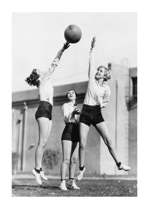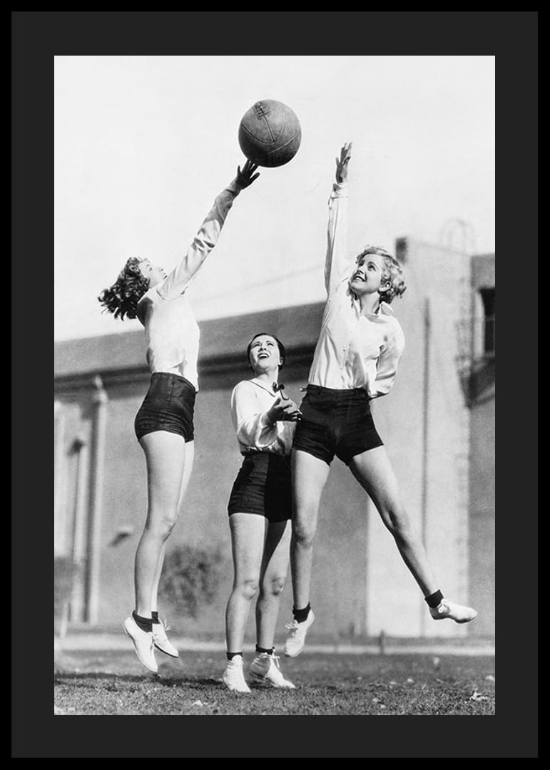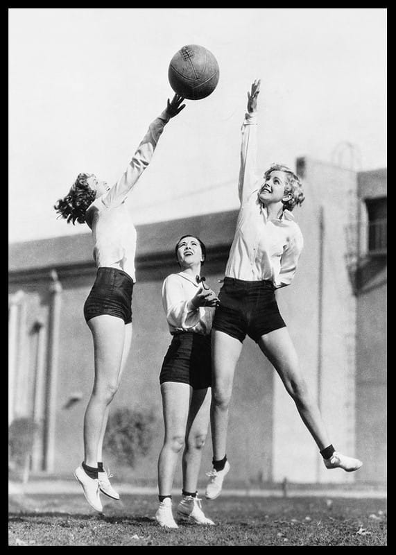 Three women in shirts and shorts jump towards a basketball in the air, photographed in motion on a grassy field outdoors. The black and white setting and the period clothing give this poster a historical feel. Suitable for offices, training rooms or living rooms that appreciate sports and vintage.