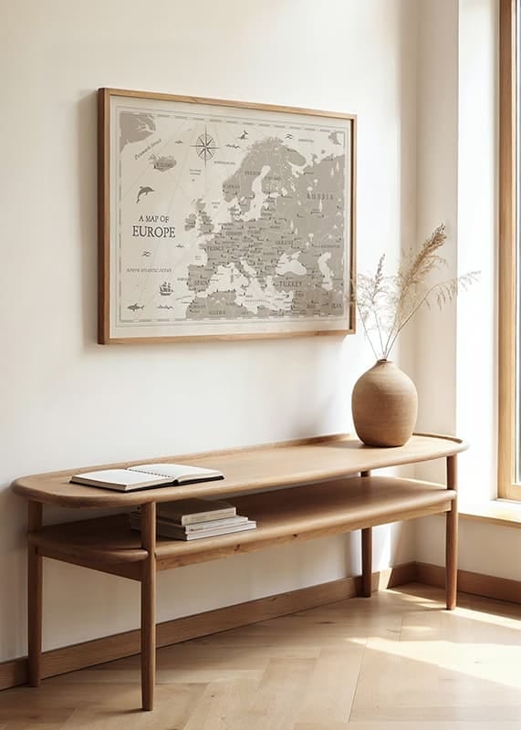 The motif shows a stylized map of Europe where countries, seas and major cities stand out clearly against a light beige background. Decorative symbols such as ships, animals and a compass rose give a classic feel. English texts are used on this poster, which is suitable for both home offices and living rooms.