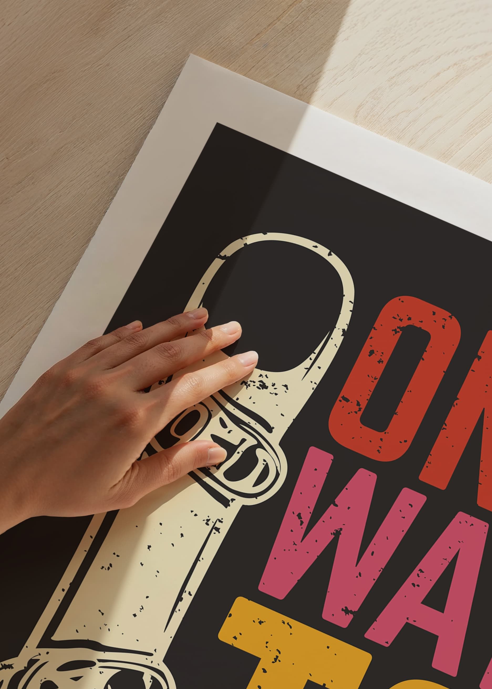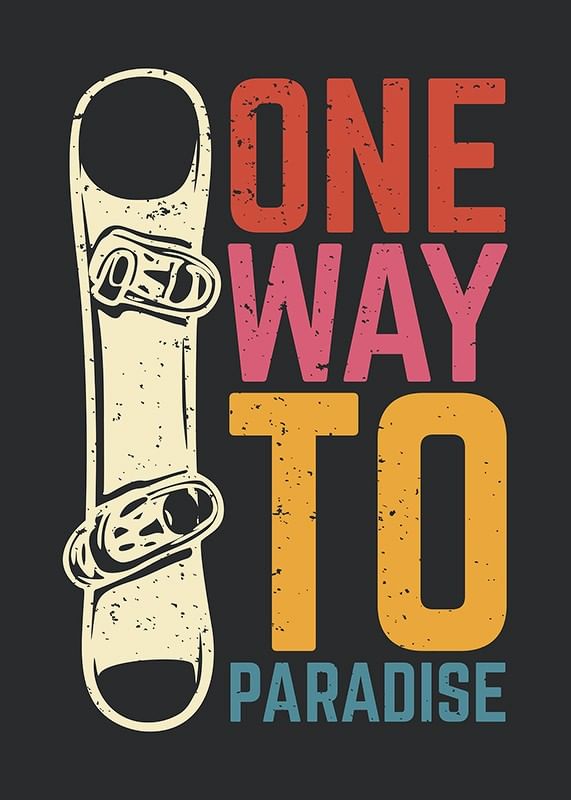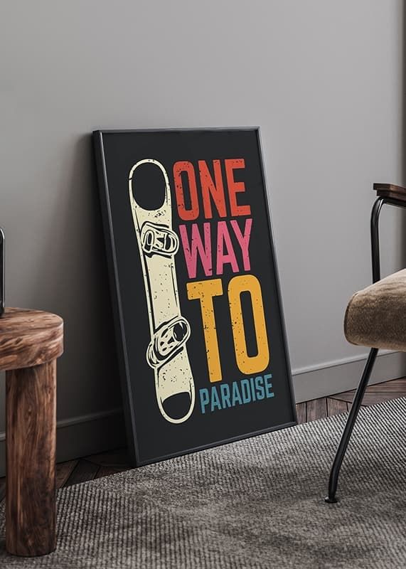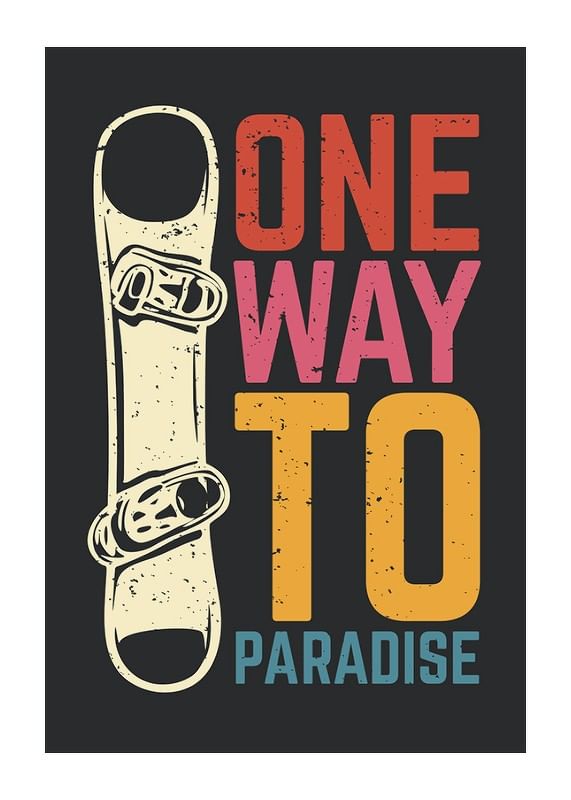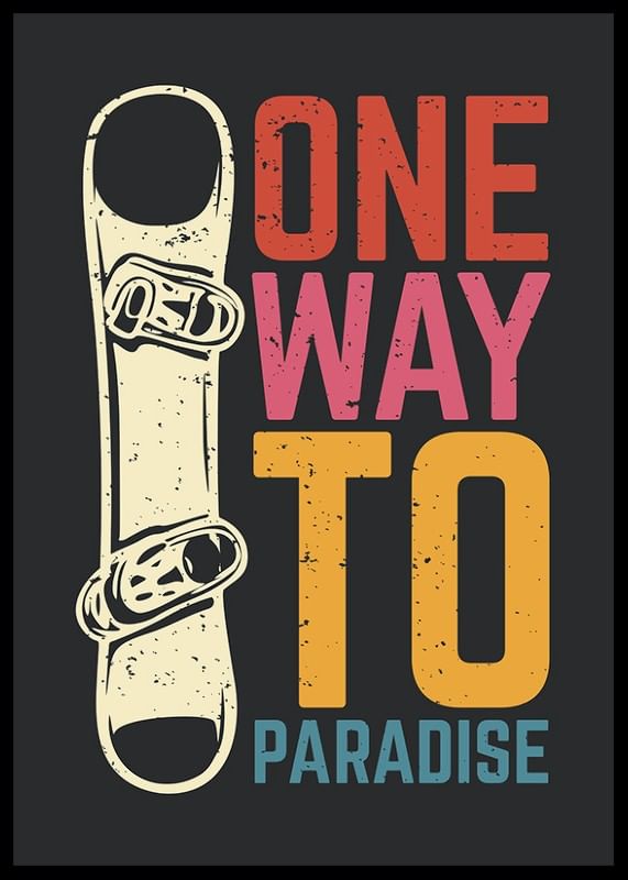 The motif consists of a stylized illustration of a snowboard in light tones against a dark background. The text "One Way To Paradise" appears in large letters in red, pink, yellow and blue next to the snowboard. A sporty and playful poster that fits well in children's or youth rooms to create energy and movement.