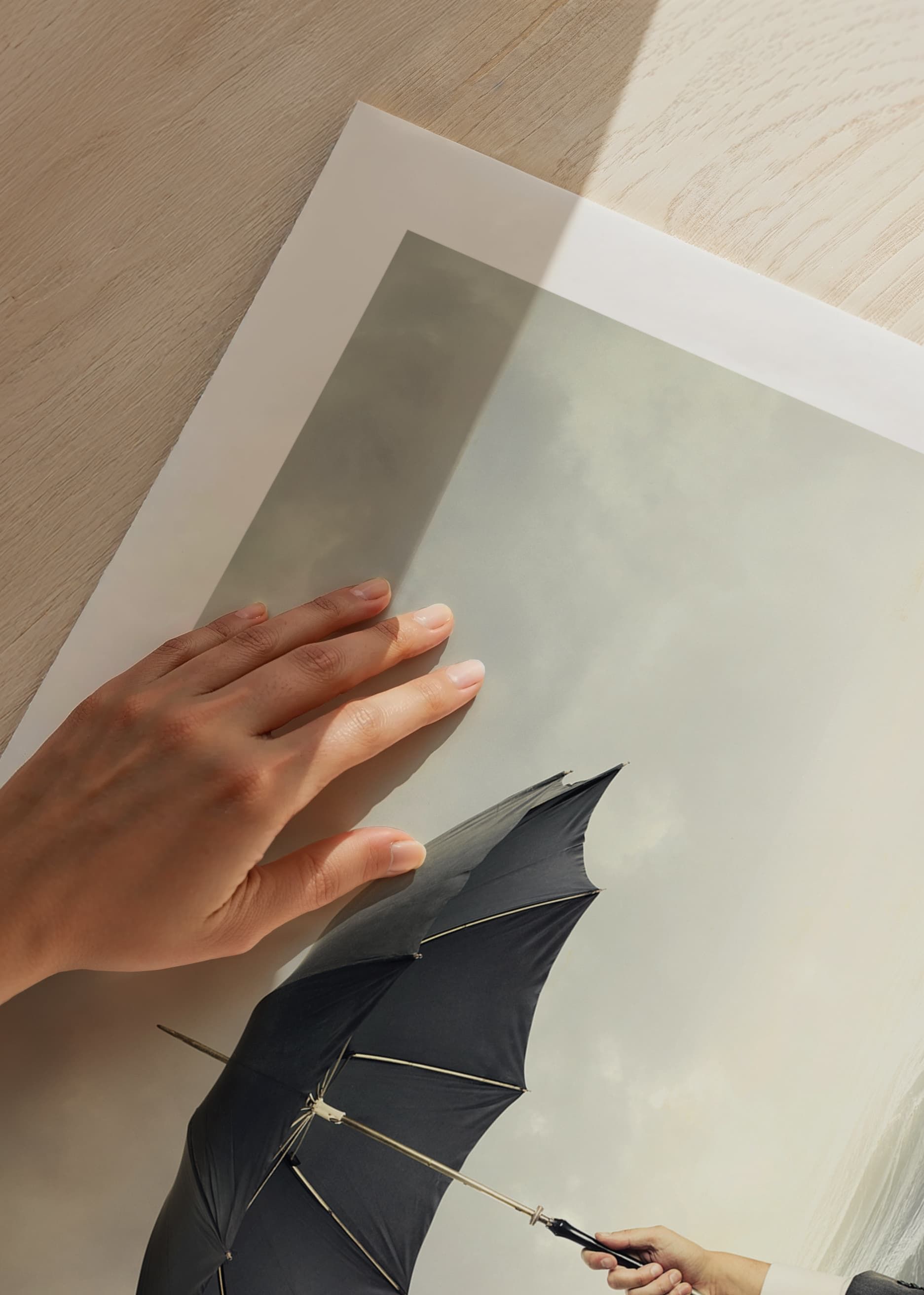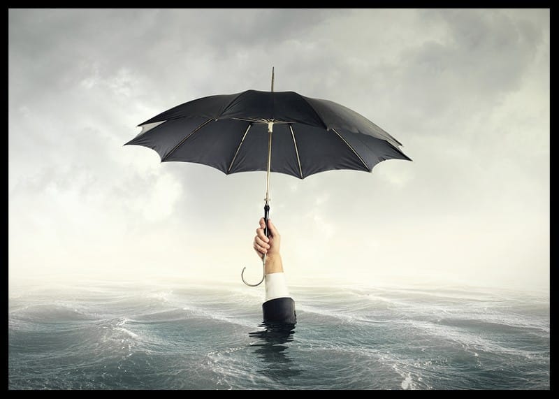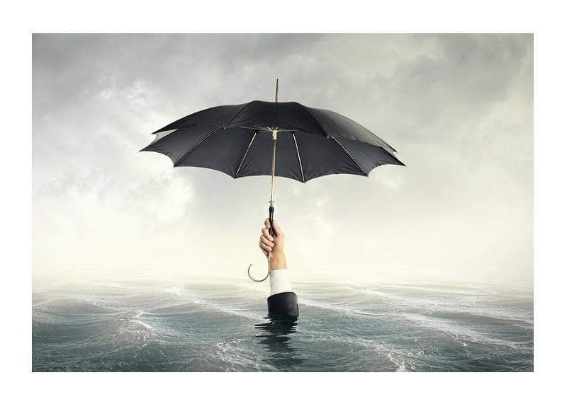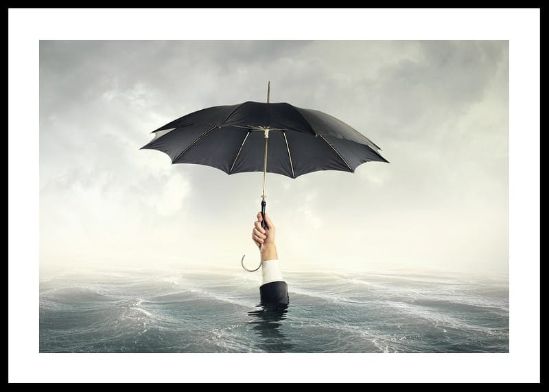 A human hand in a suit sleeve rises from a turbulent sea and holds a black umbrella against a gray, overcast sky. Surrealistic theme where the umbrella contrasts with the water and the open horizon. This poster brings a conceptual and thought-provoking expression to modern living rooms or workplaces.