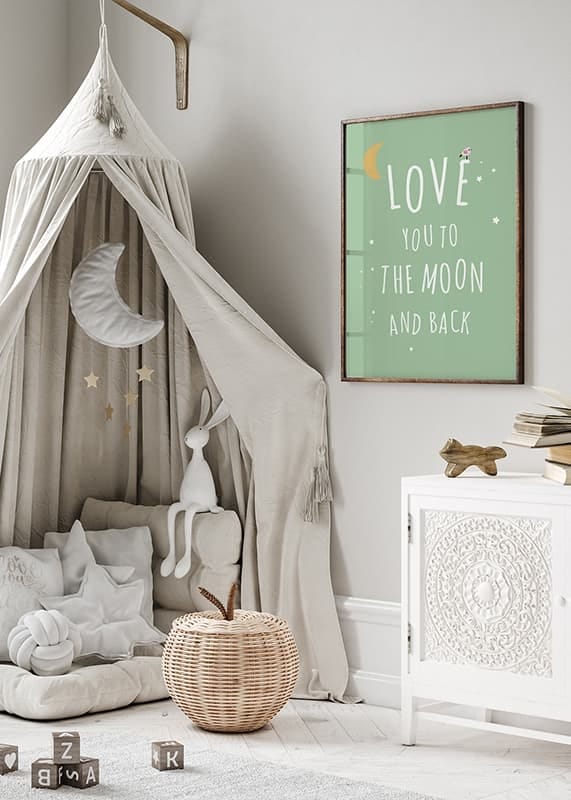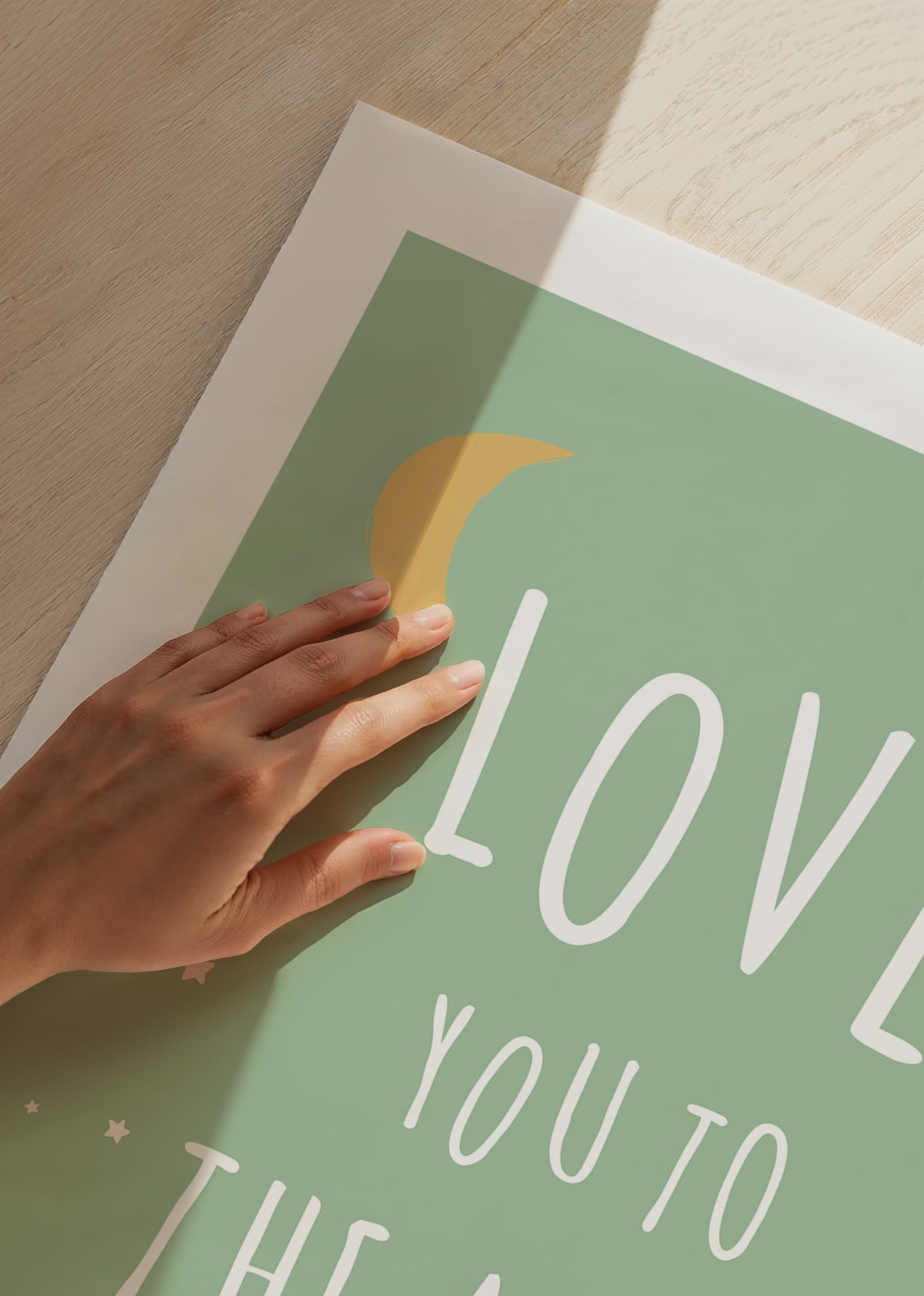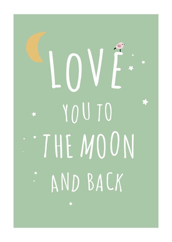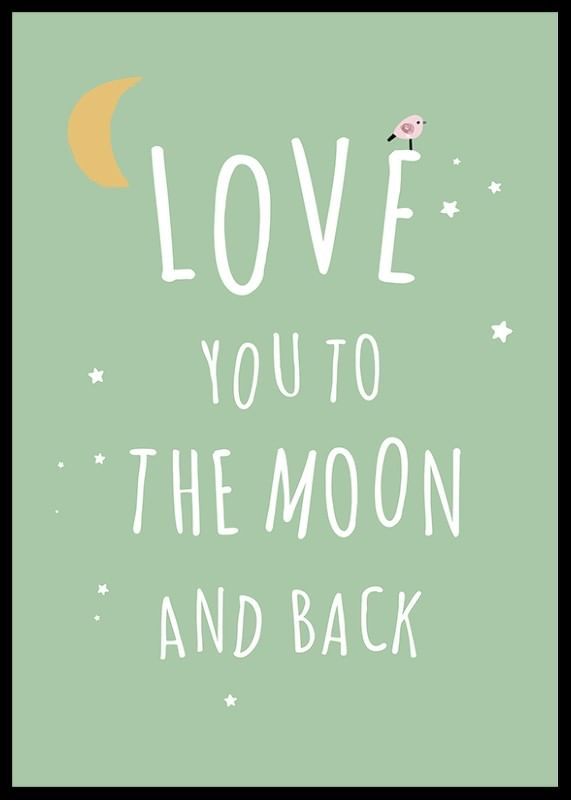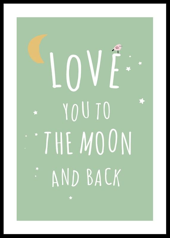 The motif consists of white handwritten text 'Love you to the moon and back' against a soft green background, surrounded by small white stars, a yellow crescent moon and a small pink bird on top of the letter V. This poster gives a friendly impression and is easy to combine with other decor, especially in a children's room or baby corner.