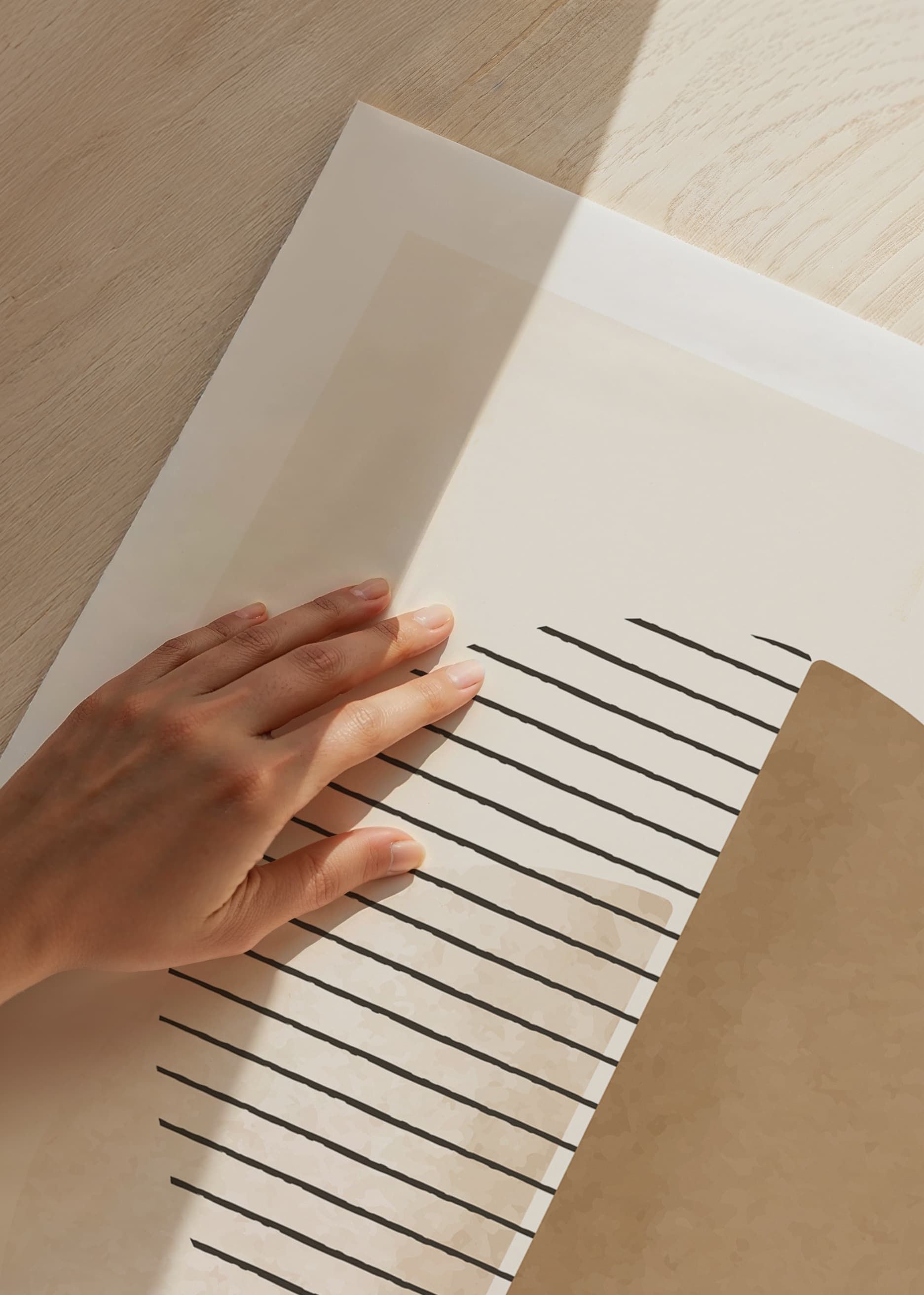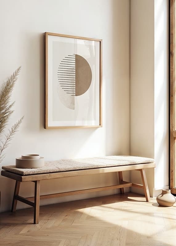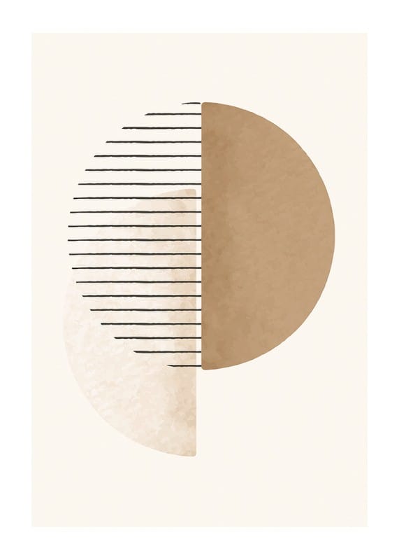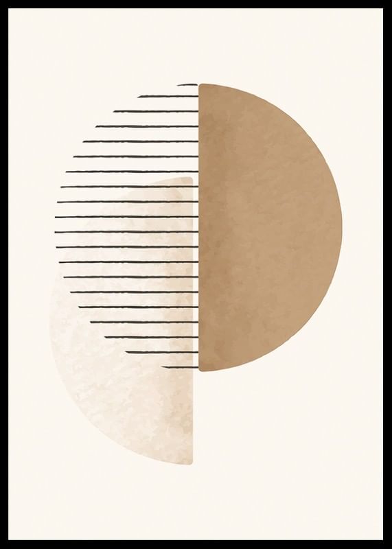 The motif consists of a circle shape divided into two halves, one side brown and the other light beige. Thin black lines run horizontally across the left side, creating a graphic impression. The neutral color tones mean that this poster complements both modern and more classic interiors.