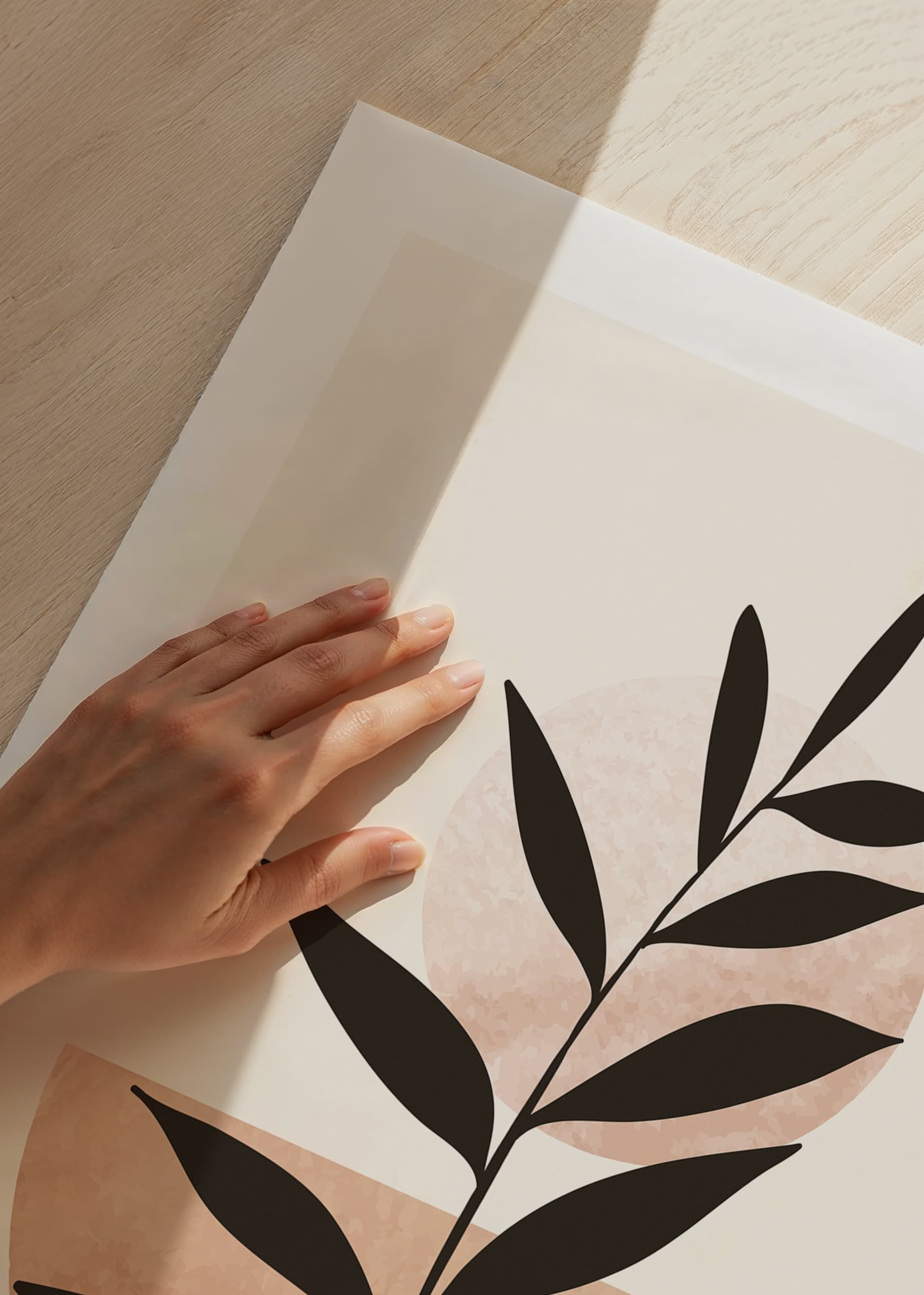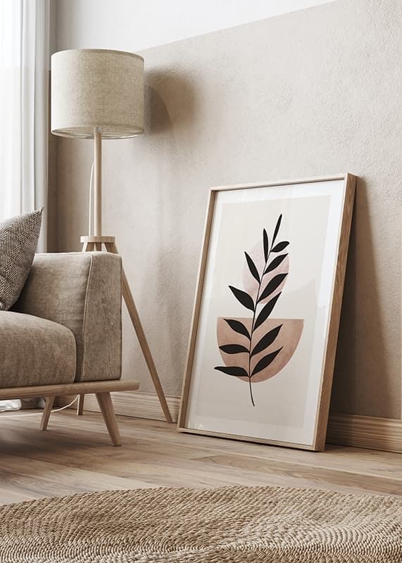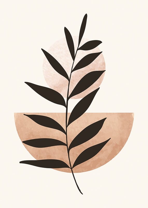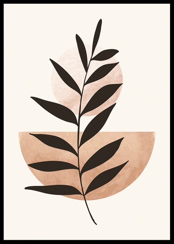 The motif consists of a stylized dark plant silhouette that stretches diagonally across a light background. A light terracotta-colored semicircle and a pale circle interact behind the plant. With its simple graphic composition, this poster fits in both the living room and bedroom and creates a modern and minimalist feel.
