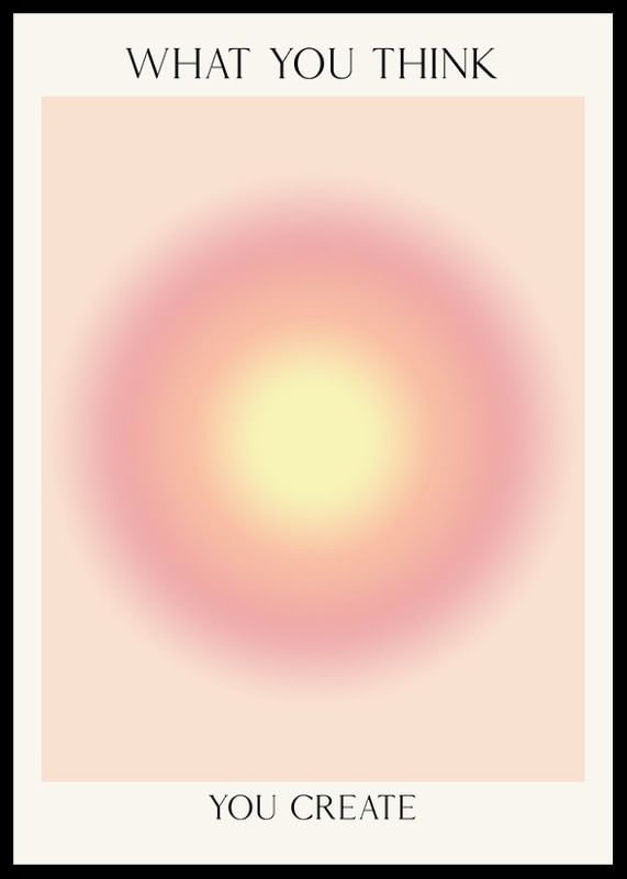 A central motif with a soft, glowing circle shape in yellow and pink shades is surrounded by a light beige background. Above and below the motif is the text 'What you think you create' in black. This poster gives a calm and reflective impression and fits into rooms where a peaceful and inspiring atmosphere is desired.