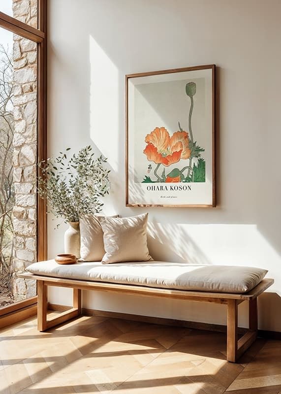 Orange poppy flower with pleated petals and green seed pod against a light, discreet background. The fine details in the leaves and the classic Japanese style give the motif a clear presence. A poster by Ohara Koson that adds subtle color and an artistic expression to the home, especially in bright rooms.