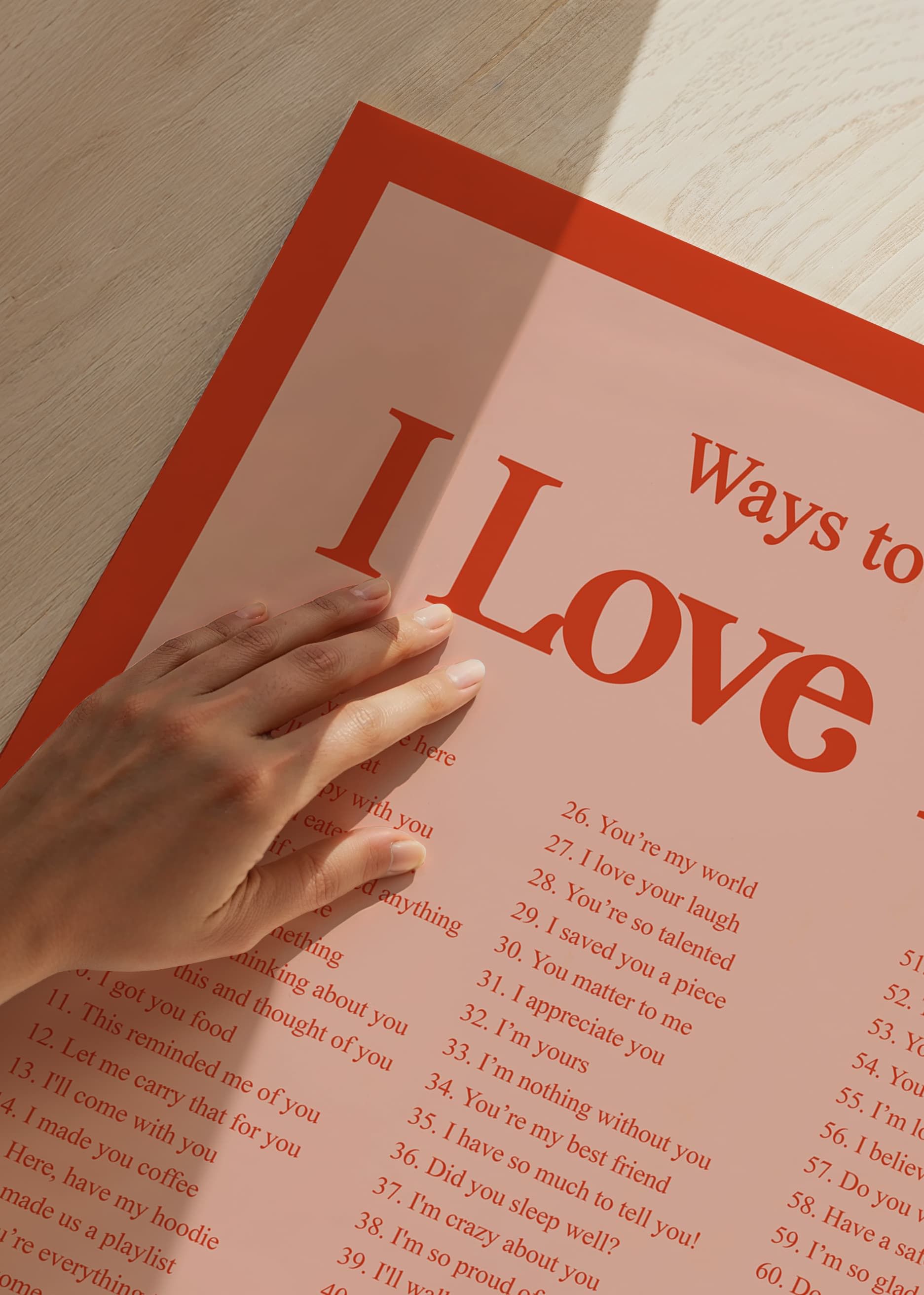 The motif consists of a typographic list of 75 English phrases that express love, presented in three columns against a light pink background and surrounded by a wide red-orange frame. Large headings and soft colors give the poster a playful impression. Suitable for homes where personal warmth and care can take place.