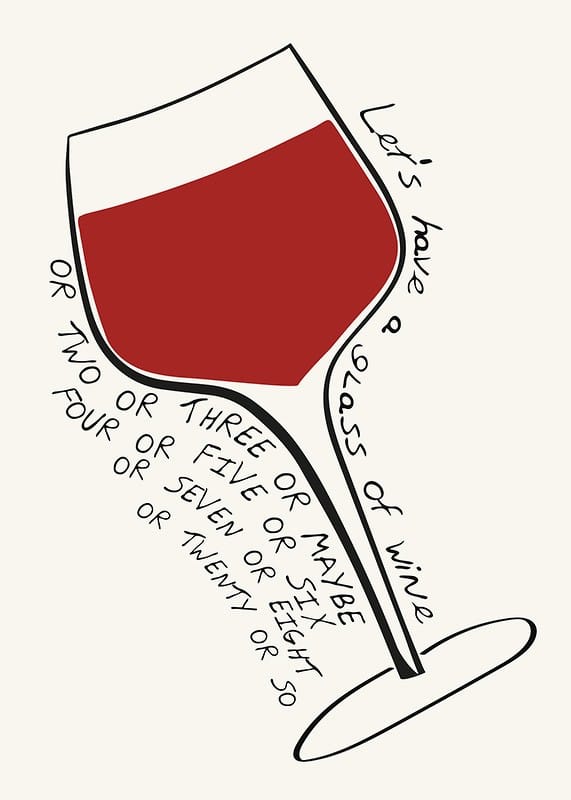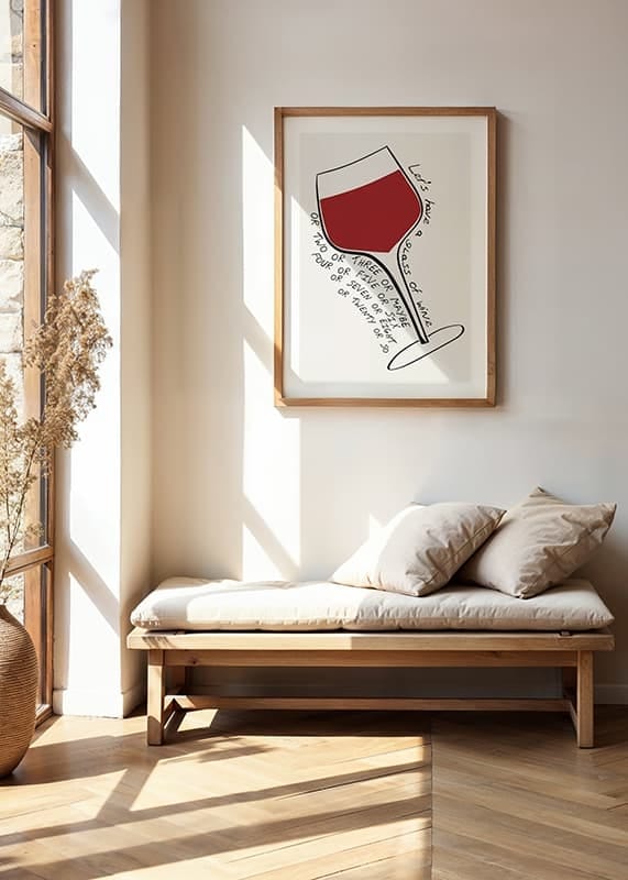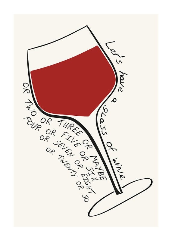 A stylized wine glass with a red drink stands in the center, drawn with black lines against a beige background. Around the glass, English words about having one or more glasses of wine playfully wind. The combination of graphic simplicity and humor gives the poster a personal character and is suitable for the kitchen table, living room or home bar.
