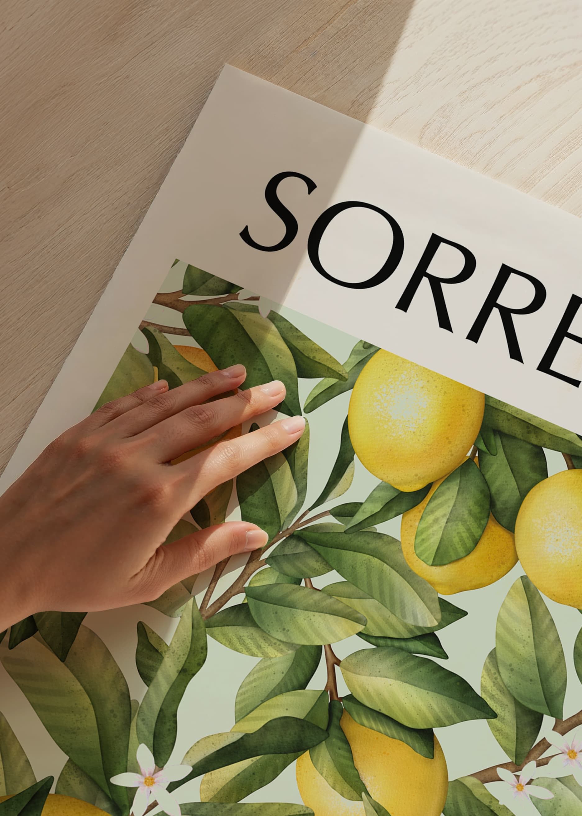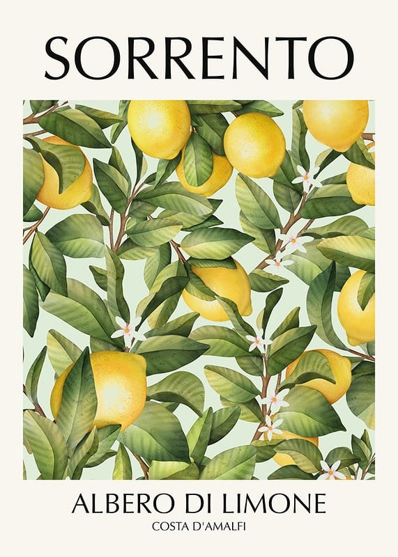 The motif consists of the branches of the lemon tree with bright yellow lemons, lush green leaves and small white flowers against a light background. At the top you can see the text 'Sorrento' and at the bottom 'Albero di Limone'. This poster is suitable for the kitchen or dining room and gives the room a feeling of the Mediterranean and freshness.