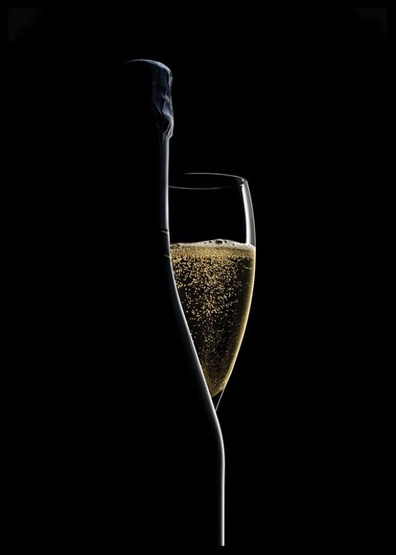 The motif consists of a narrow champagne glass filled with golden bubbles, partially obscured by the silhouette of a bottle. The deep black background highlights the bright contours and bubbles. A stylish and minimalist expression makes this poster a sober feature in the kitchen, dining room or home bar.