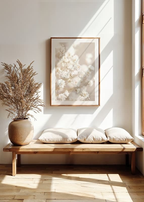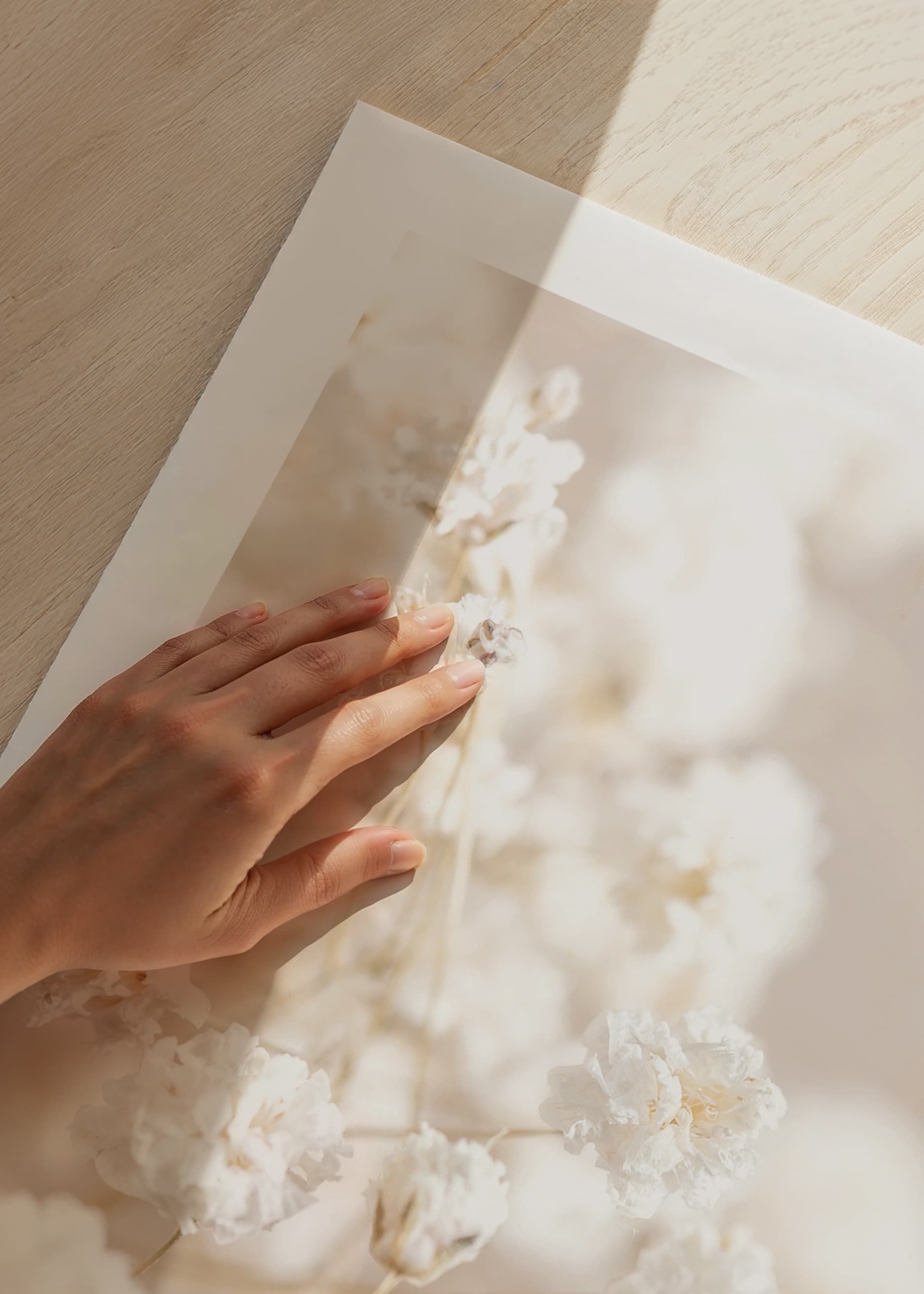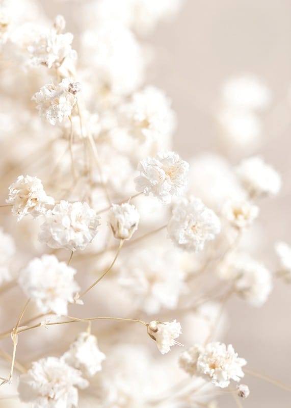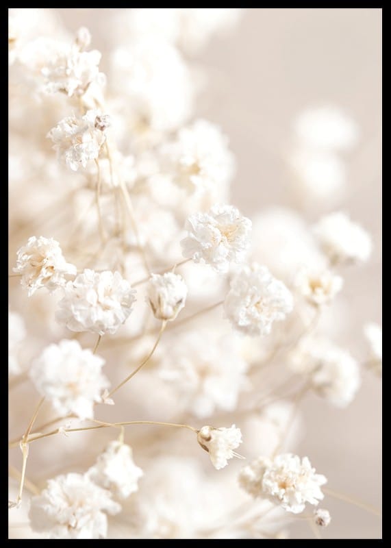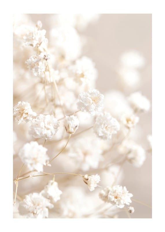 Small white bridal veil flowers appear in close-up with soft, blurred outlines against a warm beige background. The thin stems and the sheer flower clusters create an airy and light feeling. This poster is suitable for rooms where a discreet and natural spring touch is desired, such as a living room or bedroom.