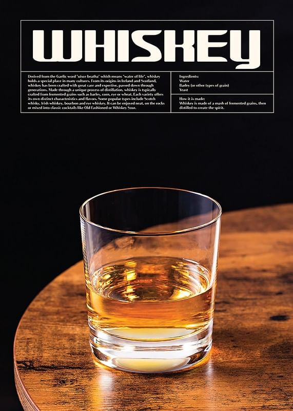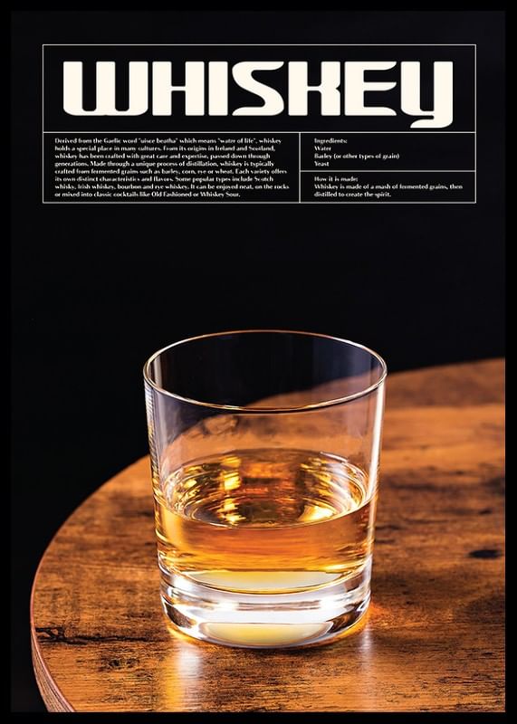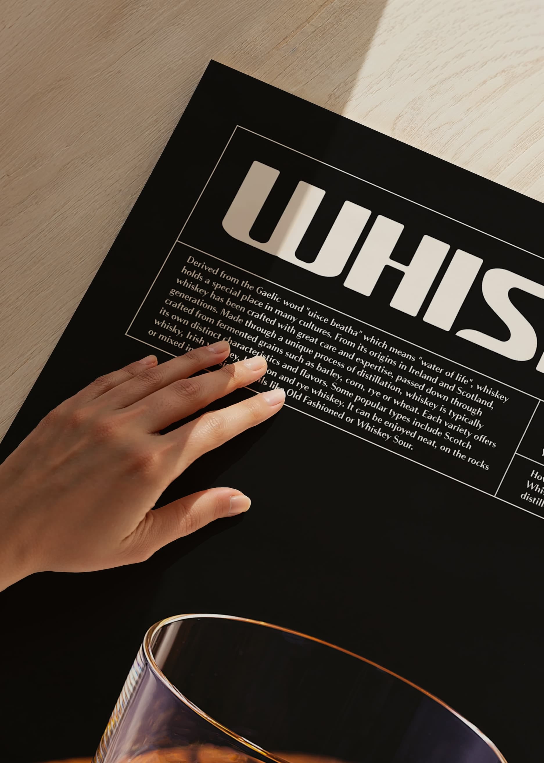 A glass of golden whisky stands on a wooden table against a black background. Above it, the word 'WHISKEY' appears in large letters along with informative text about the drink's origin and production. This poster combines stylish minimalism with solid facts and adds a tasteful touch to your home's kitchen or dining room.