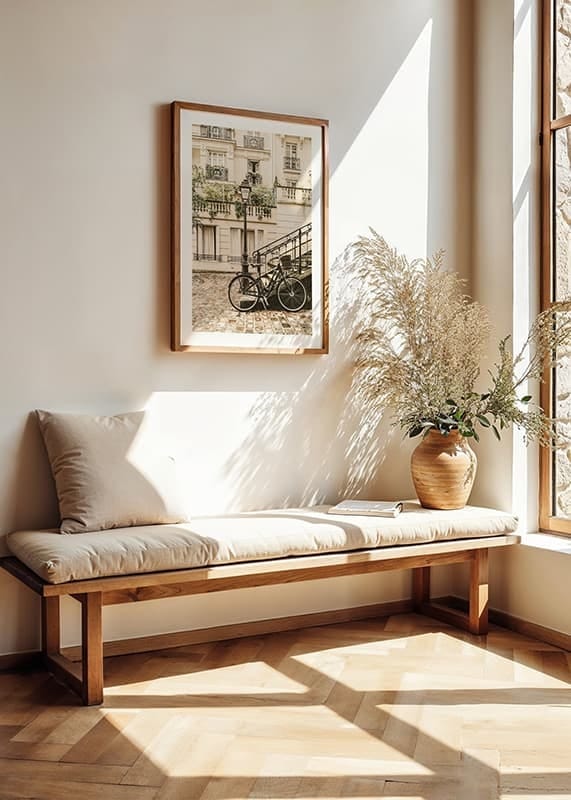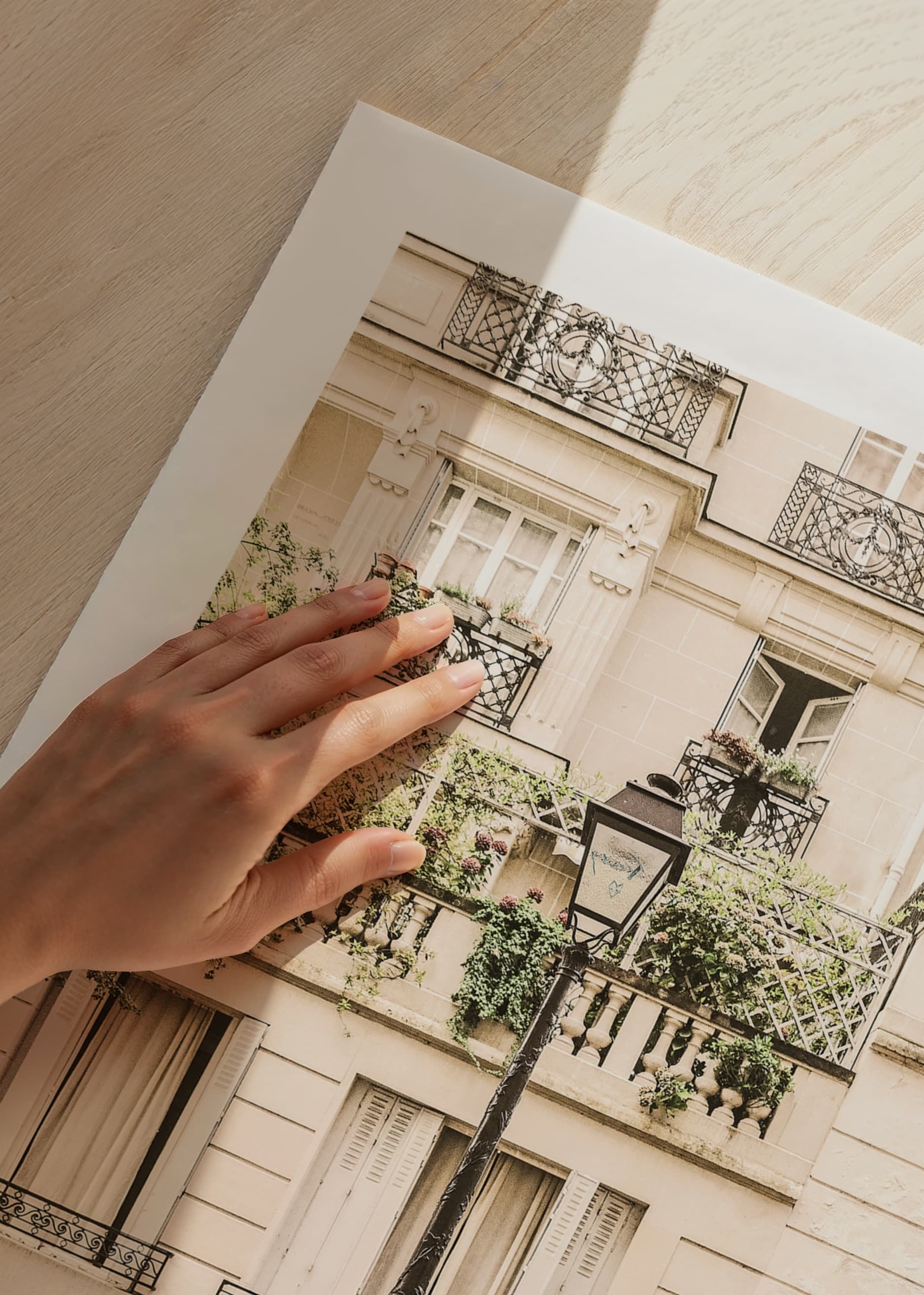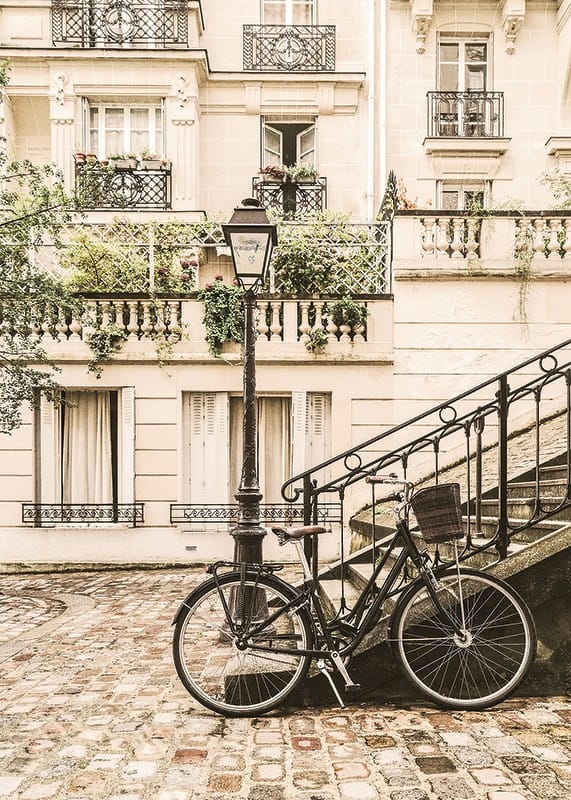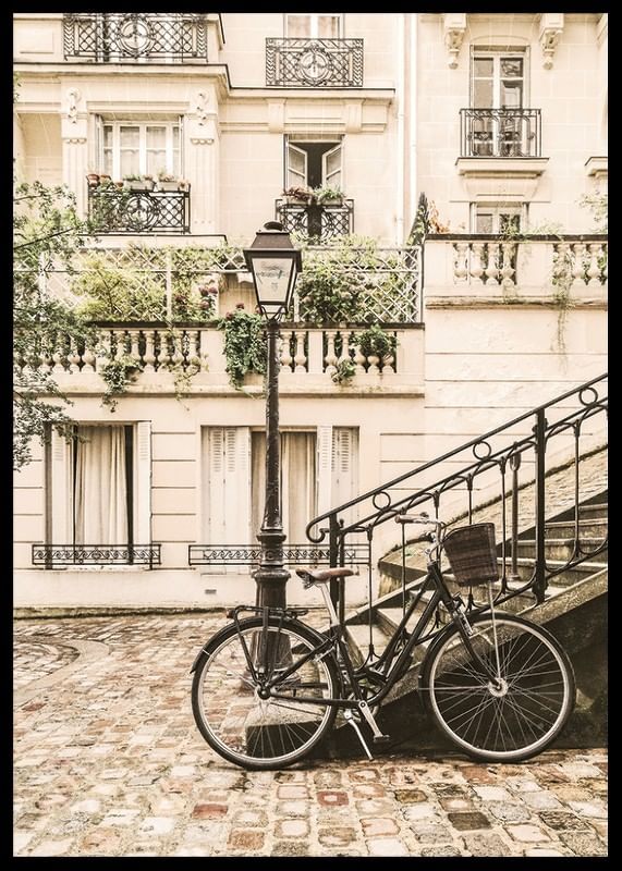 A black classic bicycle leans against a wrought iron railing next to a stone staircase. Behind it is an older Parisian house facade with light plastered walls, balconies with black railings and green plants. Muted, warm colors give the motif a timeless feel. This poster captures Parisian everyday poetry and adds French charm to the home.