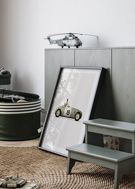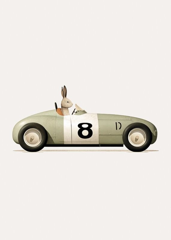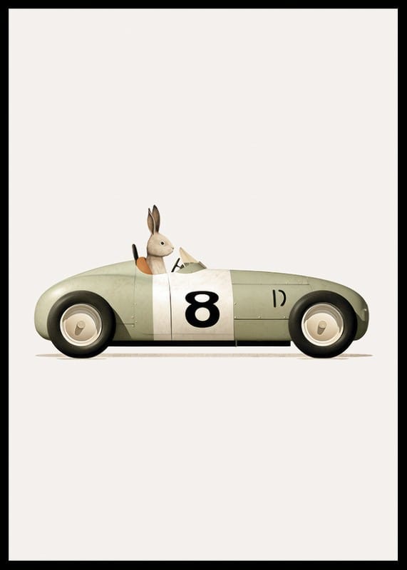 A stylized rabbit sits behind the wheel of a retro-inspired green toy car, adorned with the number 8 on a white background. The motif has clean lines and a light, minimalist background that puts the focus on the figure. This poster will lift the walls of a child's room with a playful and timeless feel.