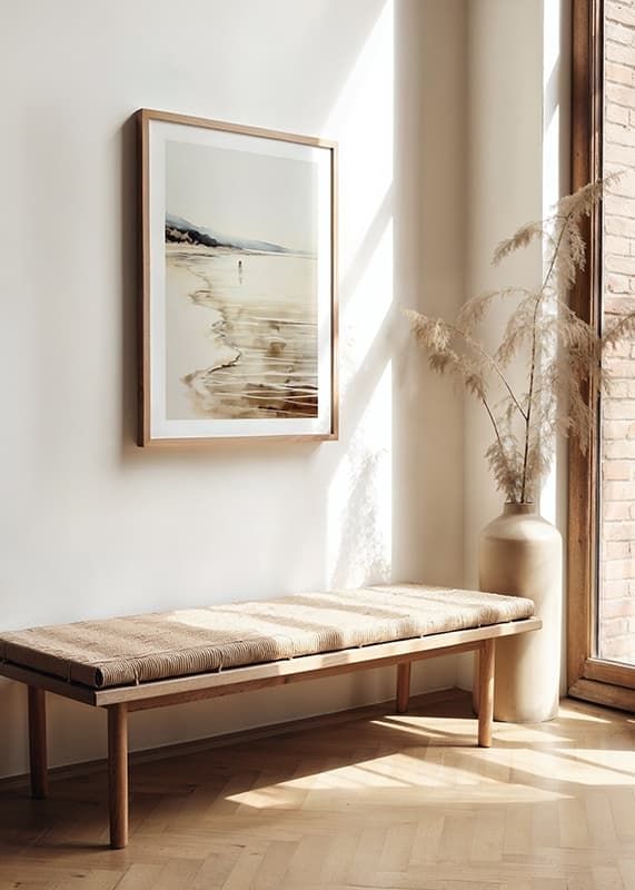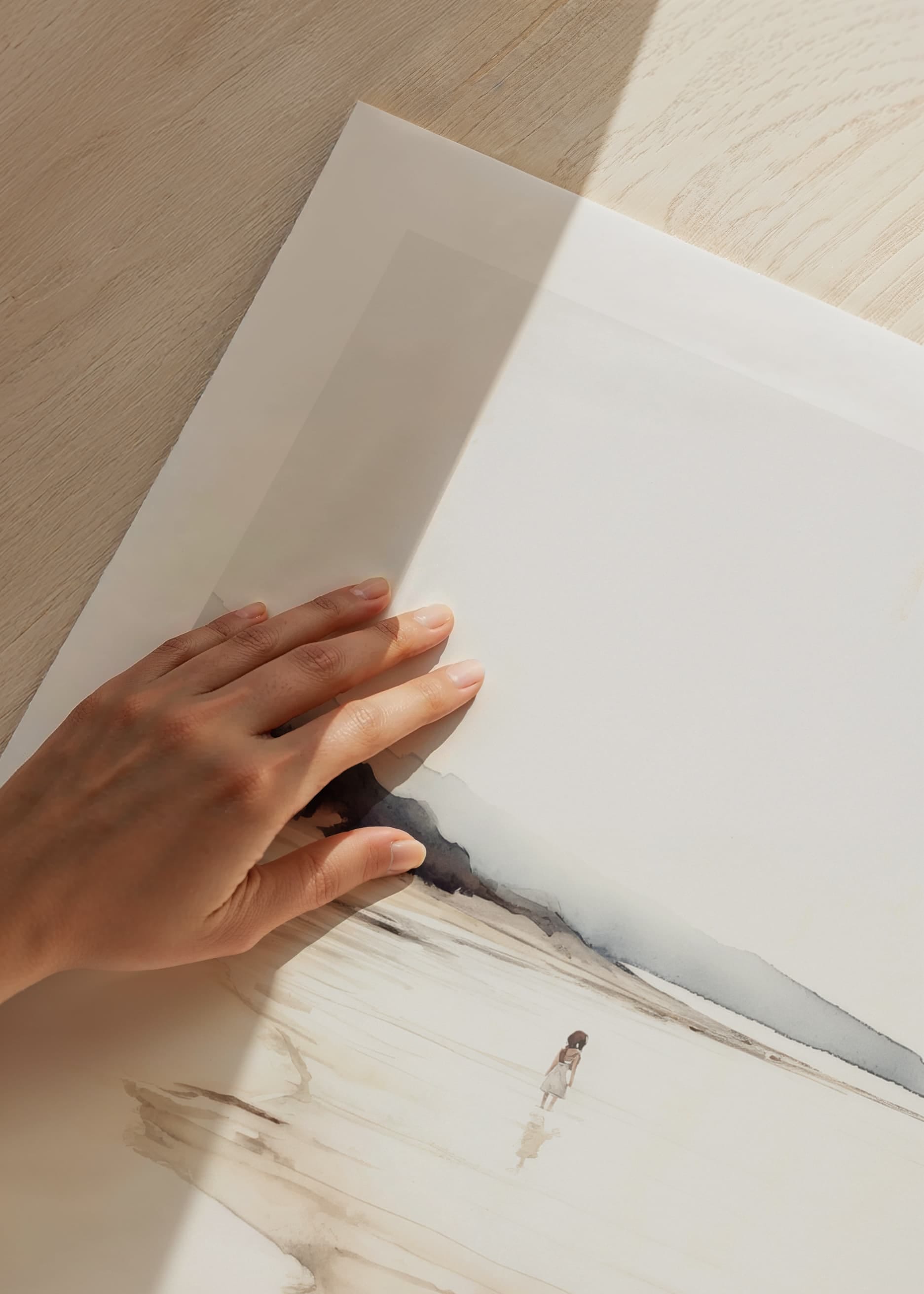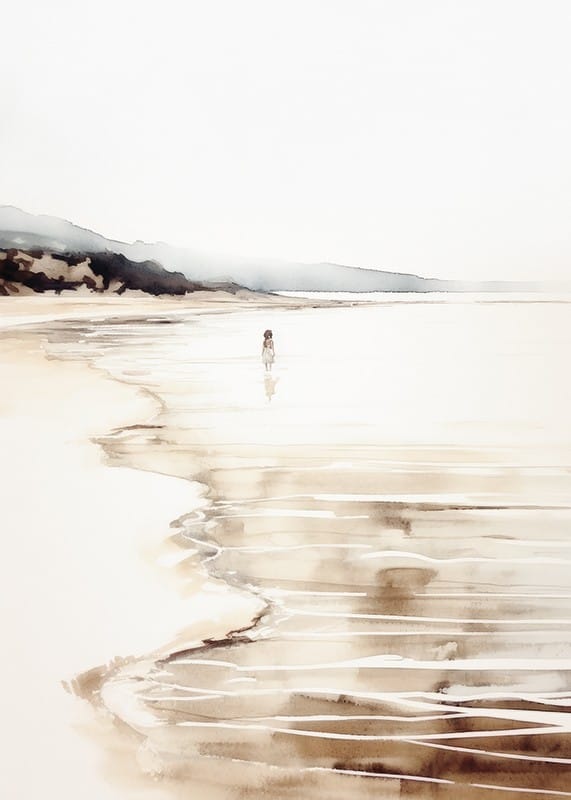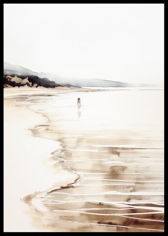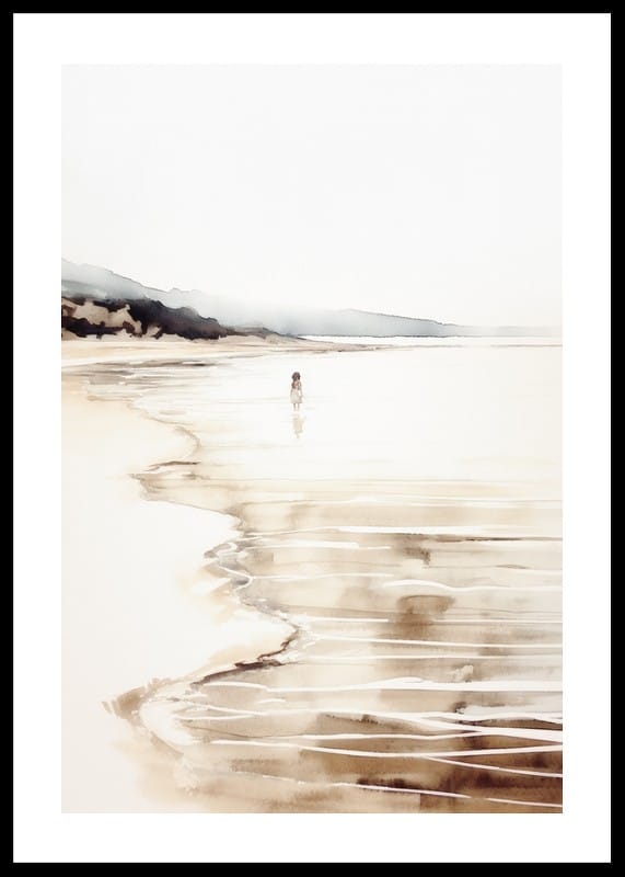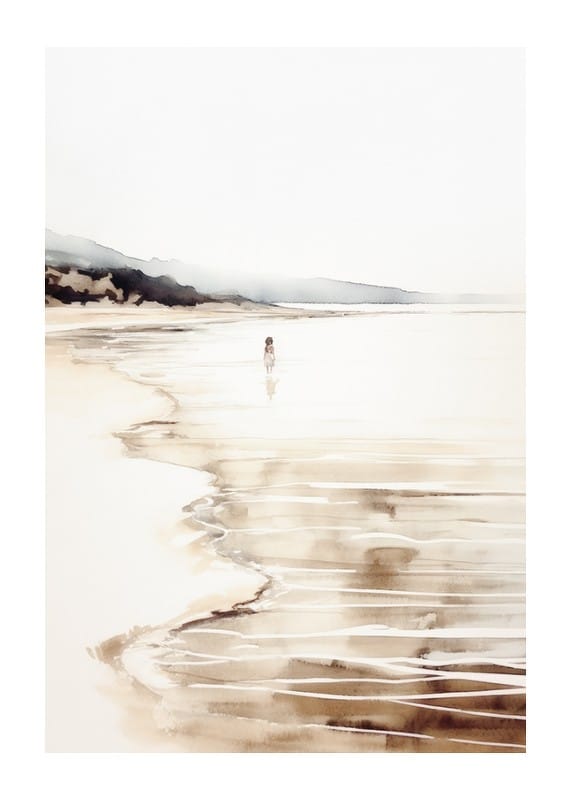 Bright watercolor with a vast sandy beach and ocean. A child is seen walking in shallow water towards the horizon, while dull rocks and shoreline are visible in the background. Soft beige and brown tones give a stripped-down feel. This poster adds a calm impression and fits nicely in a bedroom or living room, especially in natural environments.