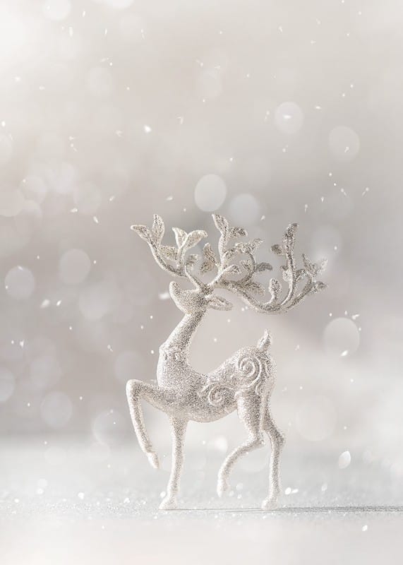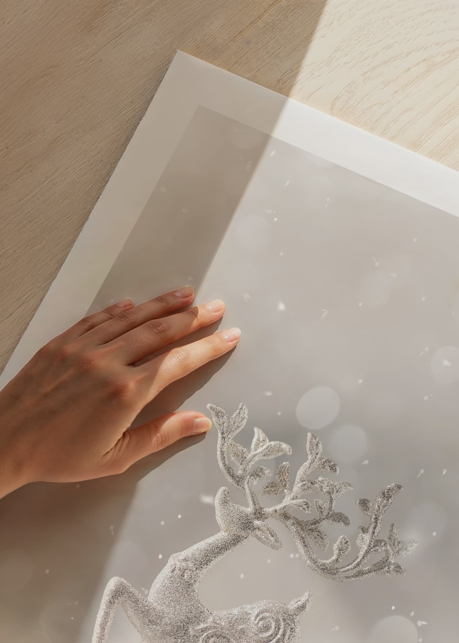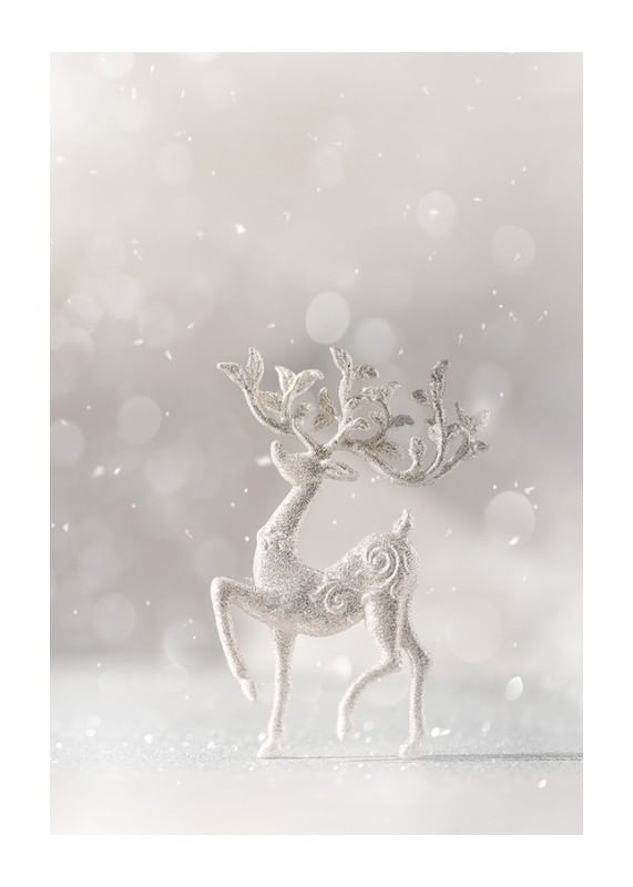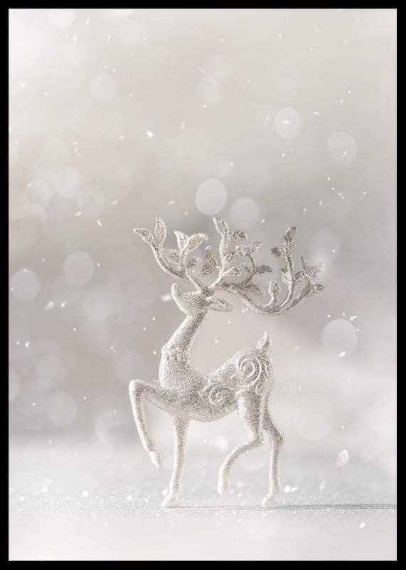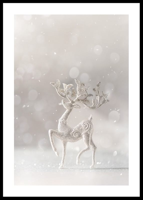A glittering silver deer with elegant, squiggly antlers stands against a bright, blurred background. Subtle snowfall and soft light create a wintery feel to the motif. The clean color palette of white and silver makes the poster an atmospheric addition to a living room, hallway or seasonal decor.