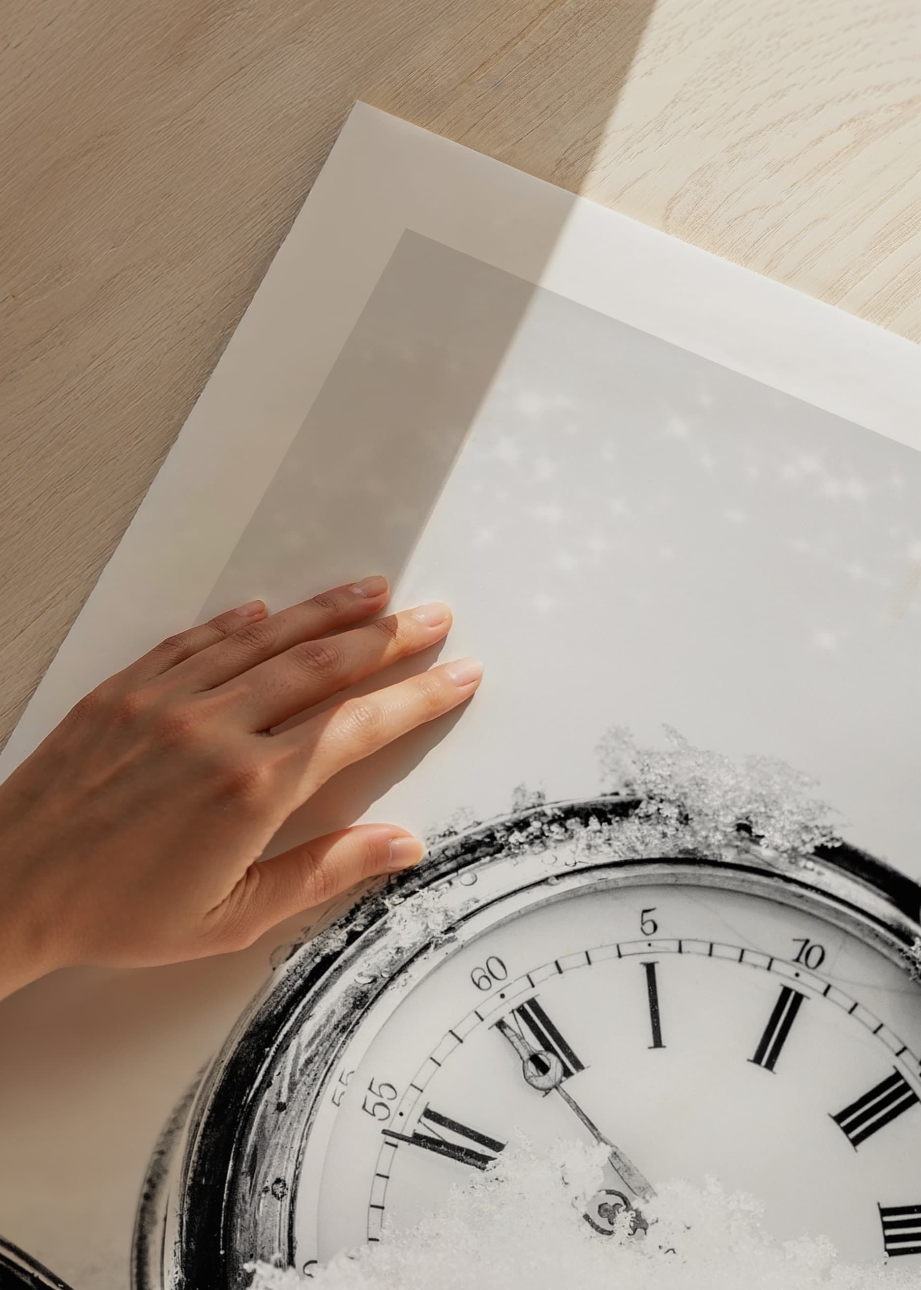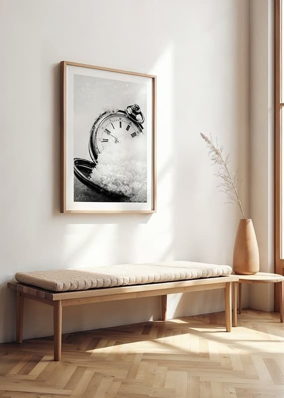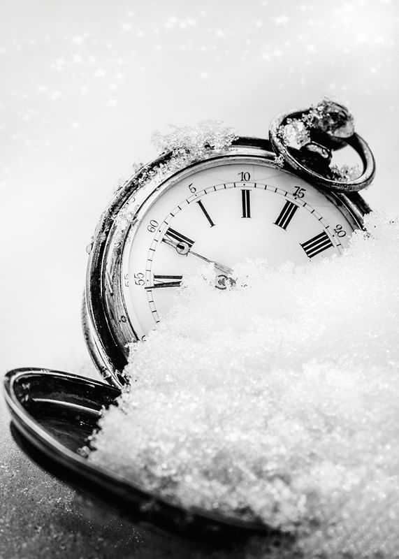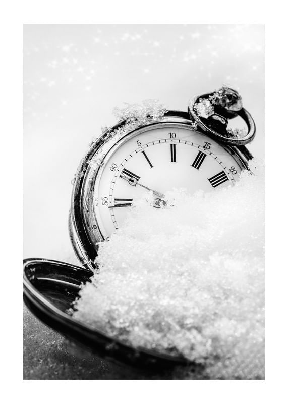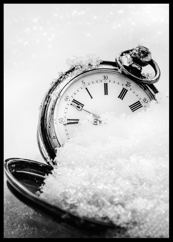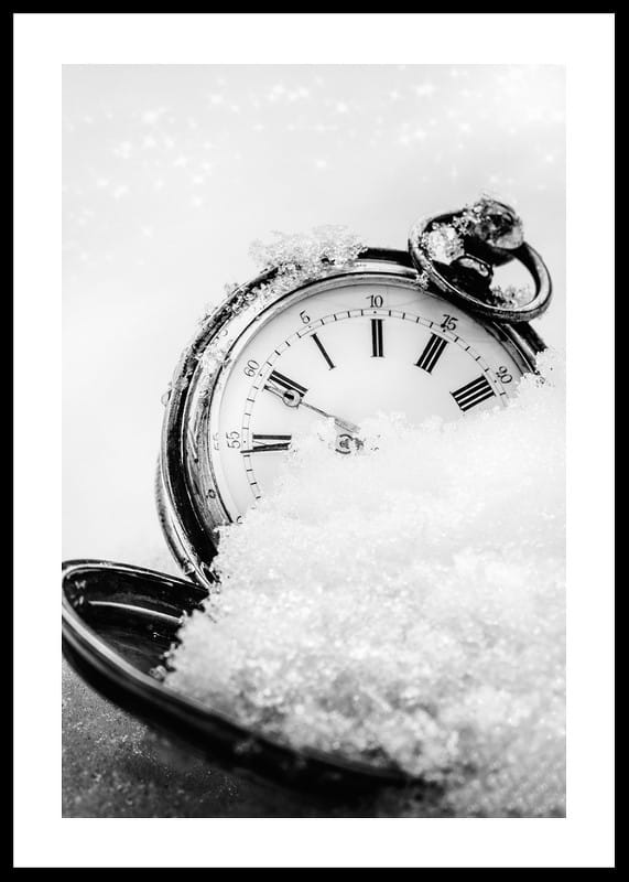 An antique pocket watch with clear Roman numerals lies partially covered in snow, captured in a black and white composition with a soft background. The ice crystal-covered details and the contrast between metal and snow create a wintry feel. This poster adds a graphic and timeless expression to the home, especially during winter and the holidays.