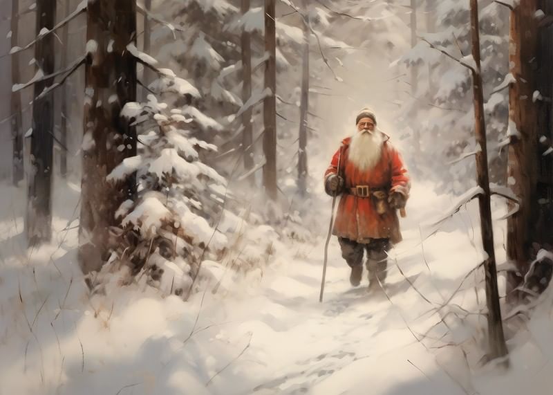 Santa Claus walks with a staff through a dense, wintry forest covered in snow. The warm reddish-brown clothing choice contrasts subtly with the bright snowy landscape and tall fir trees. Playful details such as a beard and traditional hat create a distinct Christmas feel. This poster brings a classic, Nordic winter motif to your home.