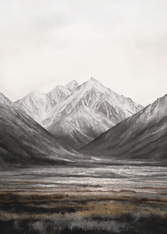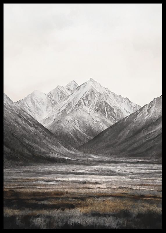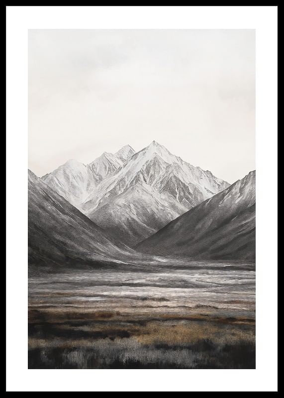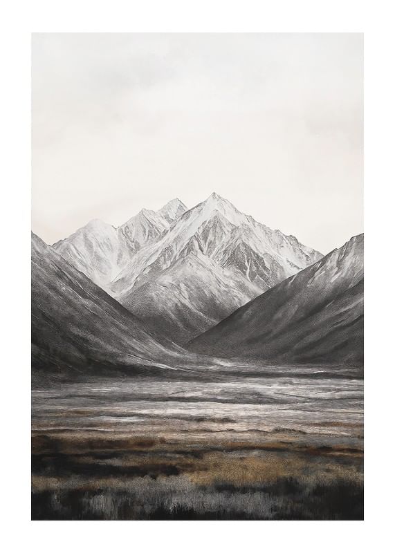Snow-capped mountain peaks rise against a bright sky, framed by soft valleys in muted shades of grey and brown. The foreground consists of an open field of grass and earth tones that provide a restful contrast to the dramatic mountains. This poster is suitable for rooms where a sense of vast nature is sought.
