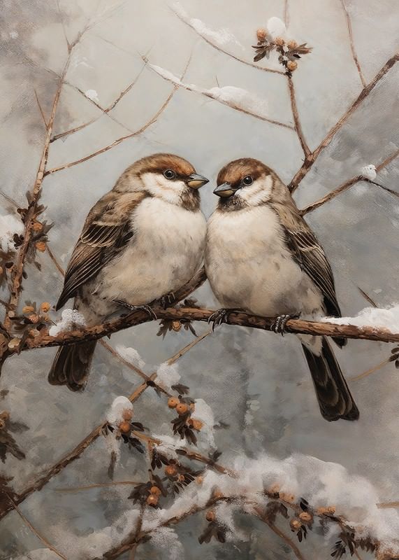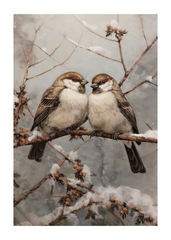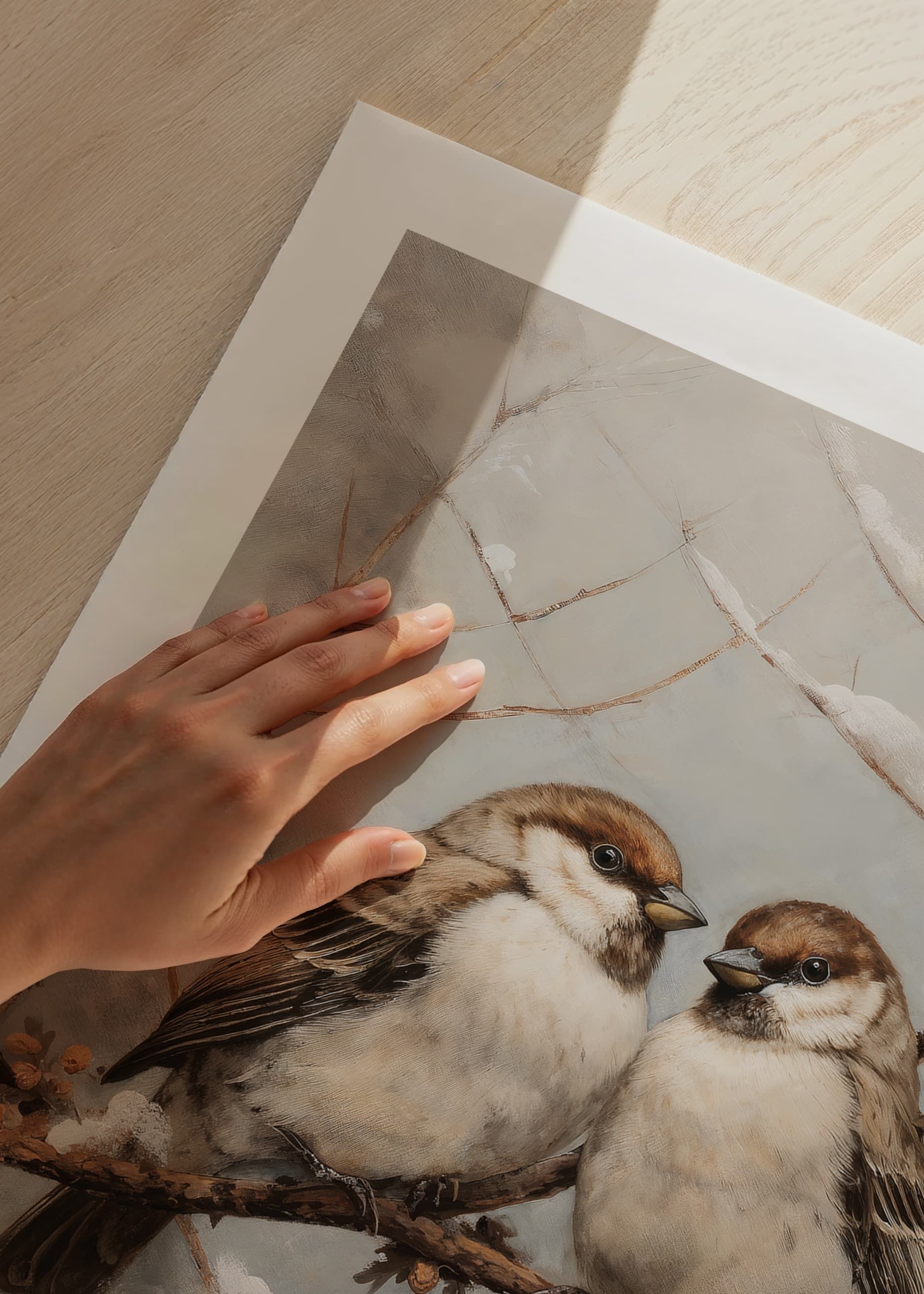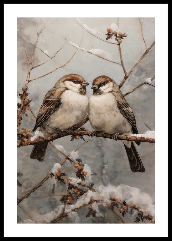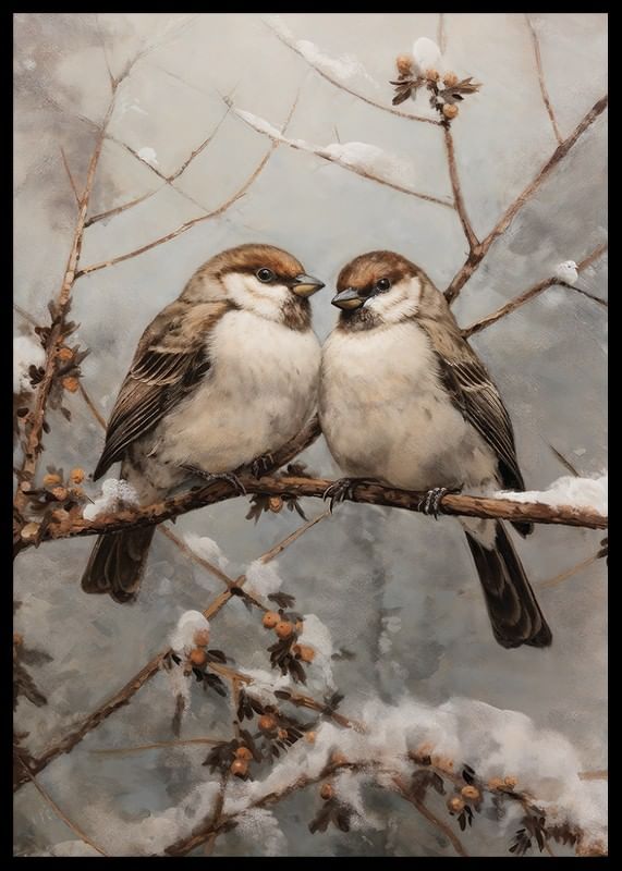Two sparrows sit close together on a branch covered in snow, surrounded by thin branches with frost and hanging brown leaves. The soft color scheme is in muted brown and white tones. The motif gives a peaceful winter feeling, and this poster is perfect for creating peace and warmth in the home.
