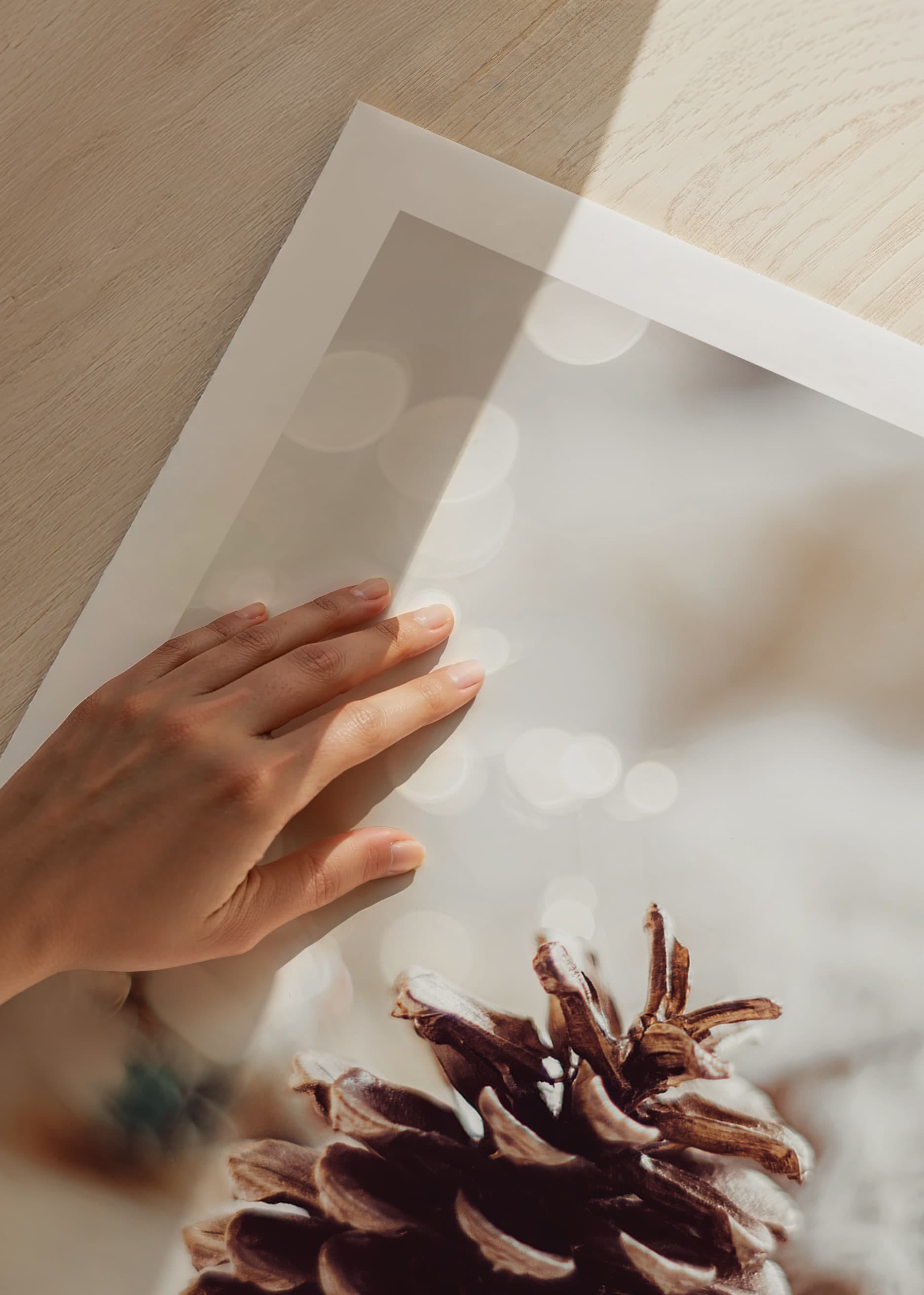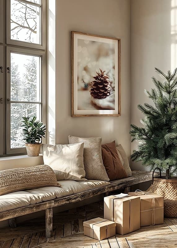 A detailed pine cone sits on a soft, knitted surface with warm, blurred points of light in the background, giving a feeling of winter and Christmas. Neutral beige and brown tones dominate the motif. This poster fits nicely in homes that want to enhance a subtle and atmospheric winter feeling during the holiday season.