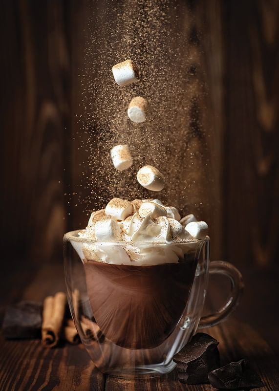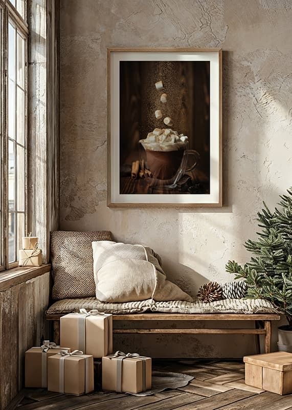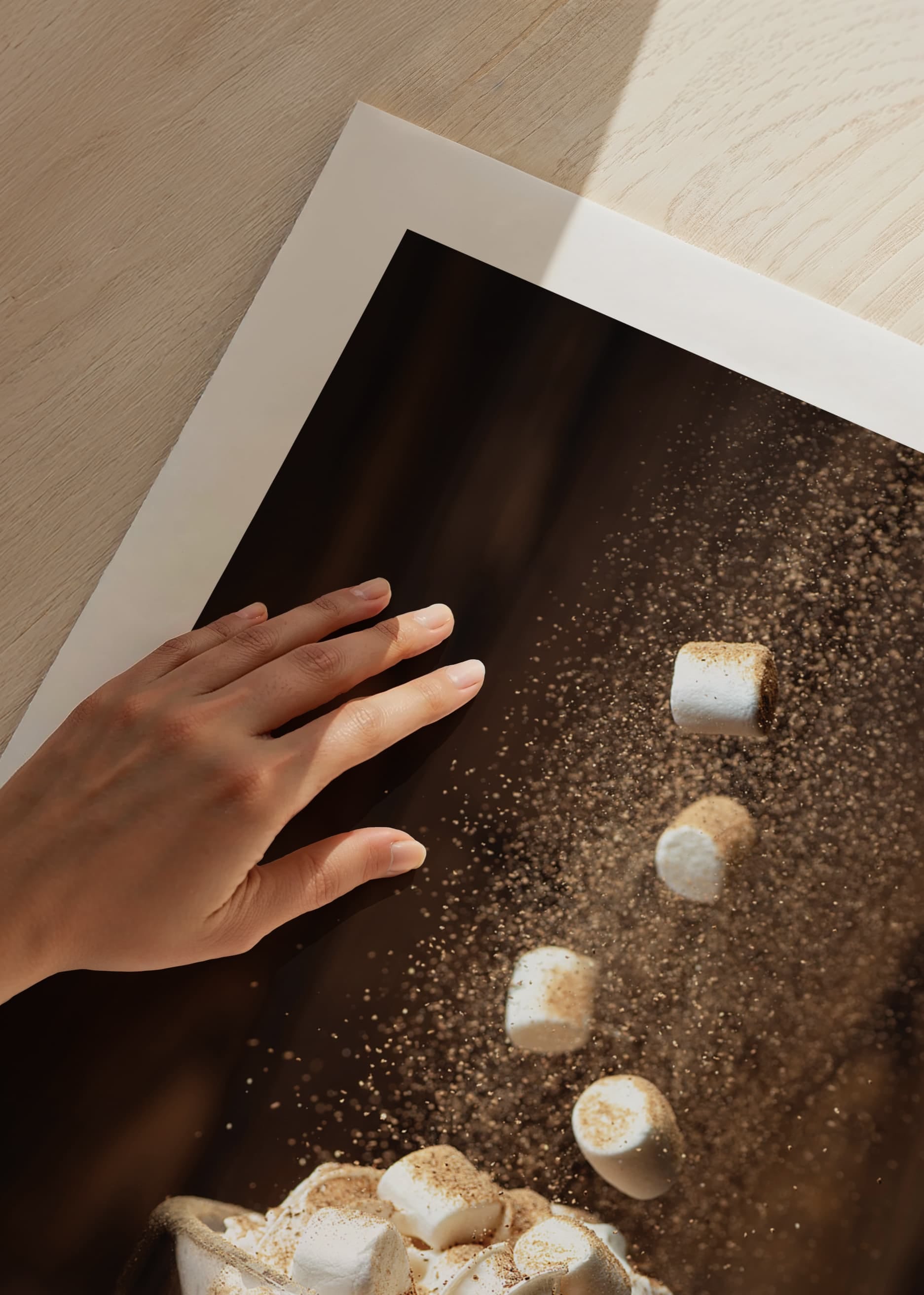 A close-up of a glass of hot chocolate topped with generous amounts of whipped cream and marshmallows falling from above. Dark chocolate and cinnamon sticks are visible on the wooden table while the background has deep brown wood tones. This poster brings an inviting and wintery feel to a kitchen, dining room or coffee corner.