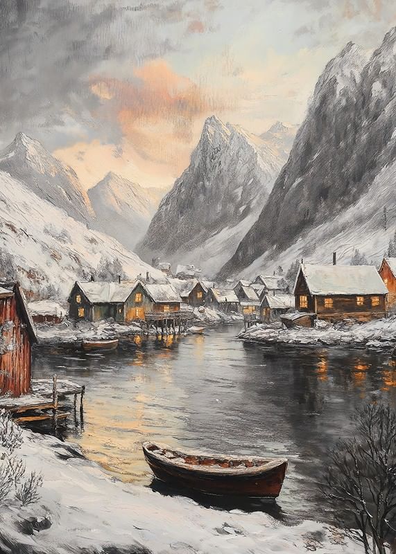 Snow-capped mountains surround a small village next to a quiet fjord, where wooden houses with lit windows are reflected in the water. A rowing boat lies on the shore and the evening sky has soft touches of orange. The combination of warm lights and cold winter tones makes this poster suitable for both living rooms and hallways.