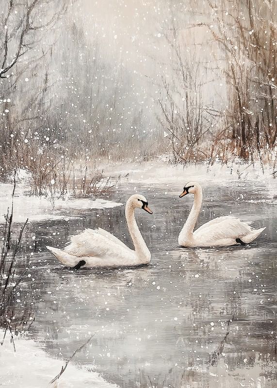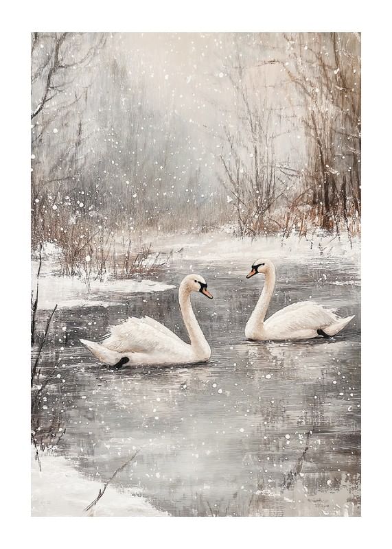 Two white swans swim peacefully on a partially ice-covered pond surrounded by winter trees and snowfall. The colors are in soft gray, white and beige tones that highlight the quiet winter nature. This poster gives a seasonal feel and is suitable for rooms where nature motifs and a minimalist winter atmosphere are desired.
