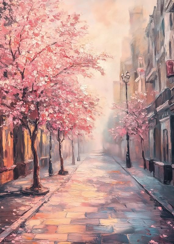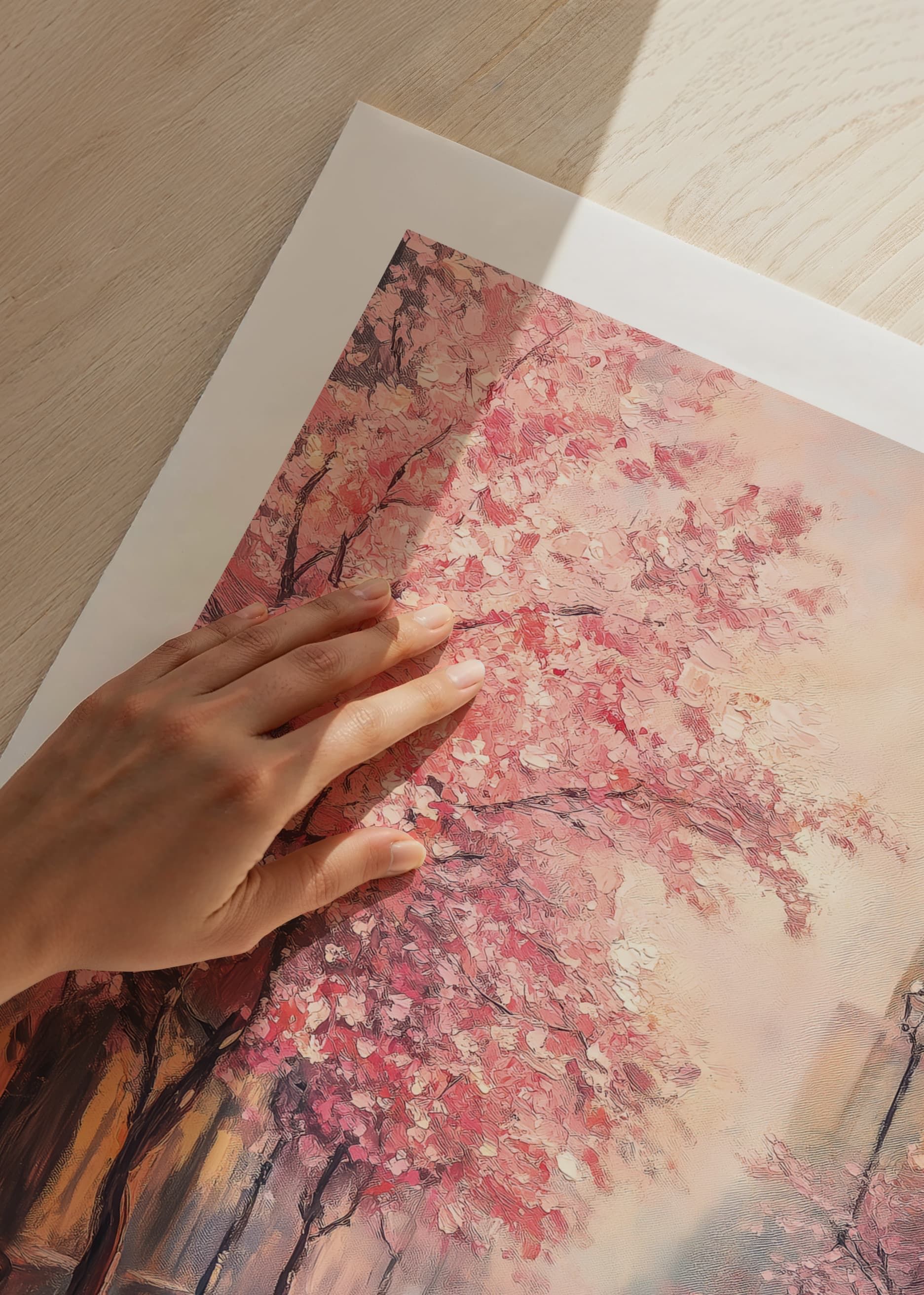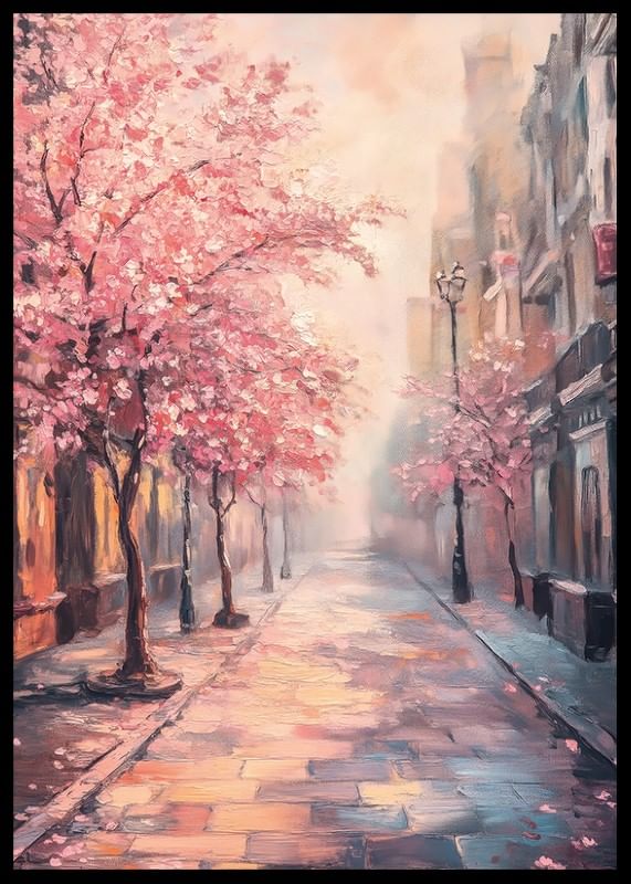The motif consists of a city street lined with cherry trees in full bloom, where pink flowers form a soft canopy over the wide stone slabs. Light is reflected against the surface of the street and gives a subdued glow. This poster gives a feeling of spring and fits nicely in a living room or hallway for a fresh and bright expression.