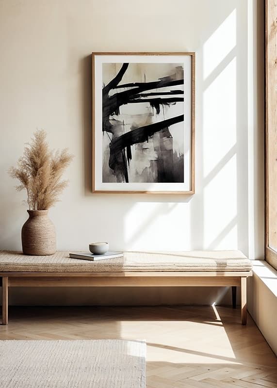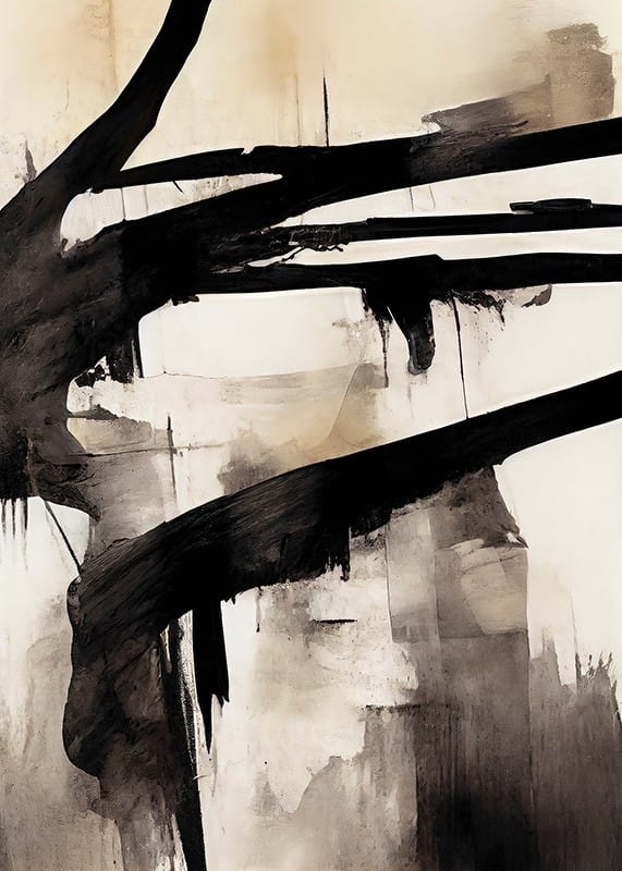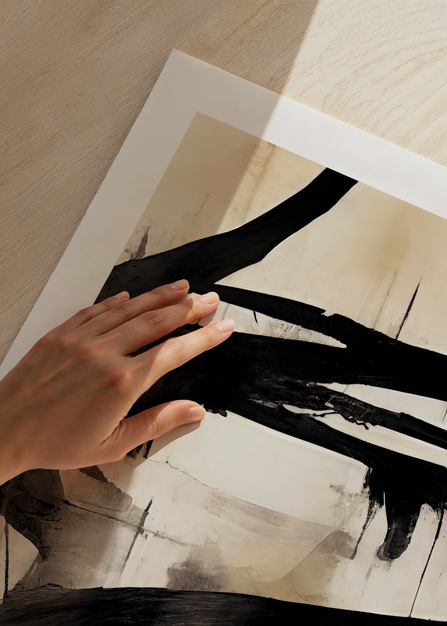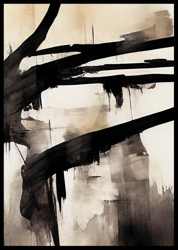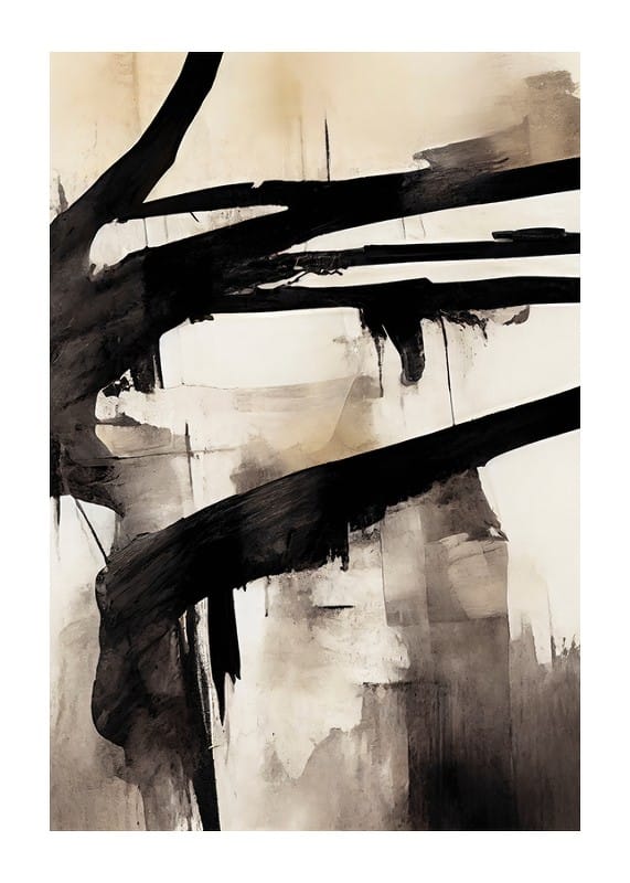 Large black brushstrokes sweep across a light background with touches of beige and grey tones. Abstract shapes with changing shades create a dynamic and modern feel to the motif. This poster is perfect as a decorative detail in both living rooms and study rooms where artistic expressiveness is desired.