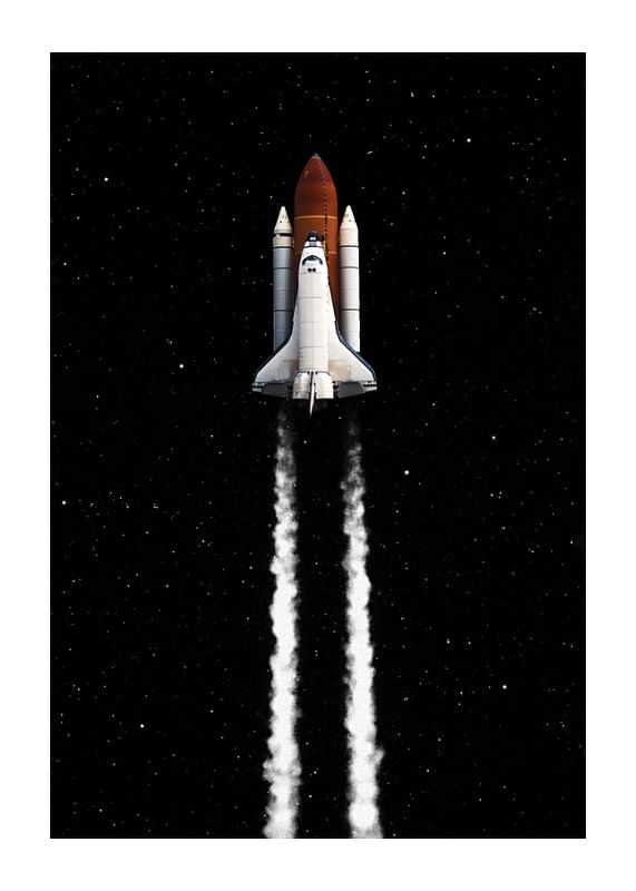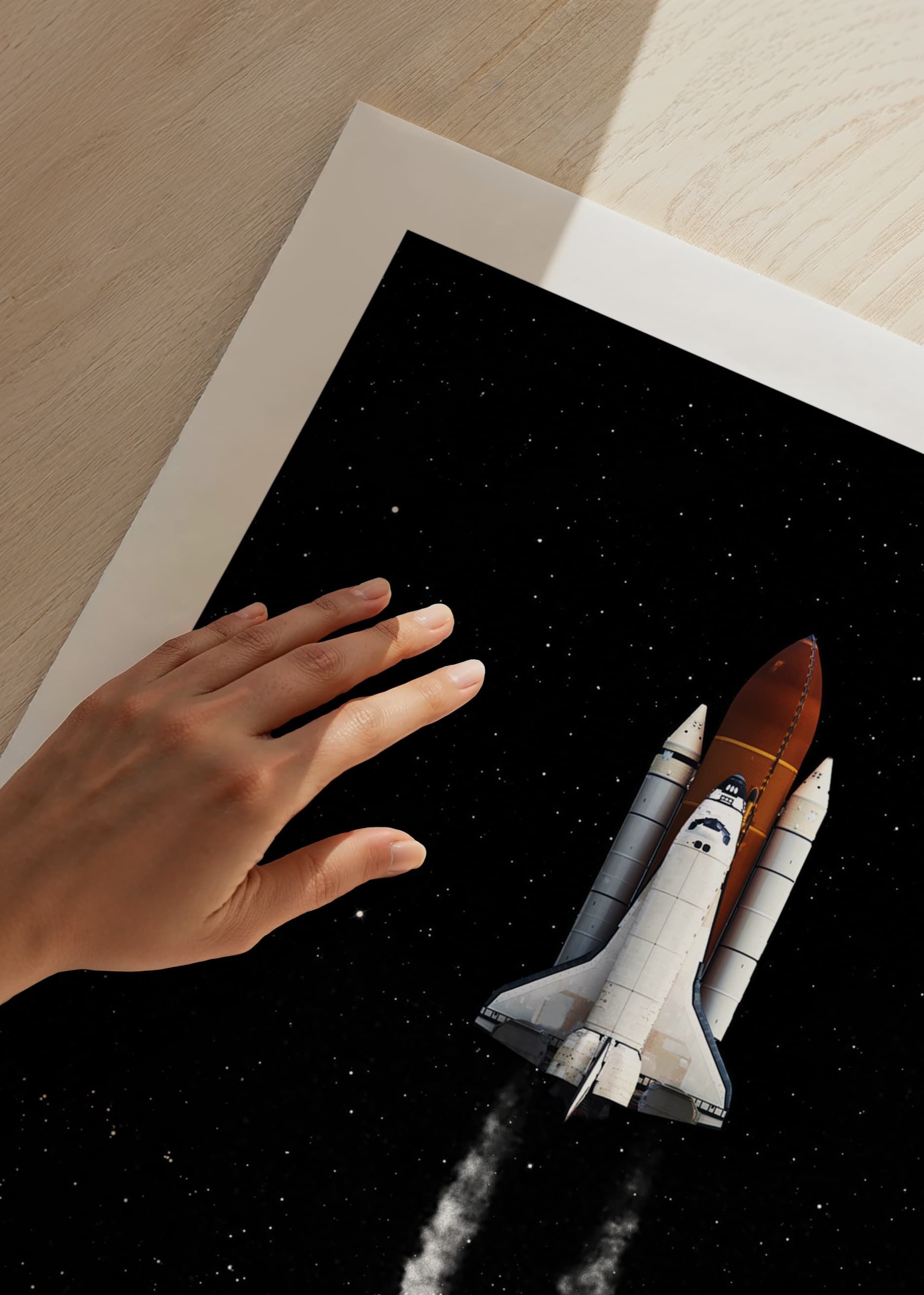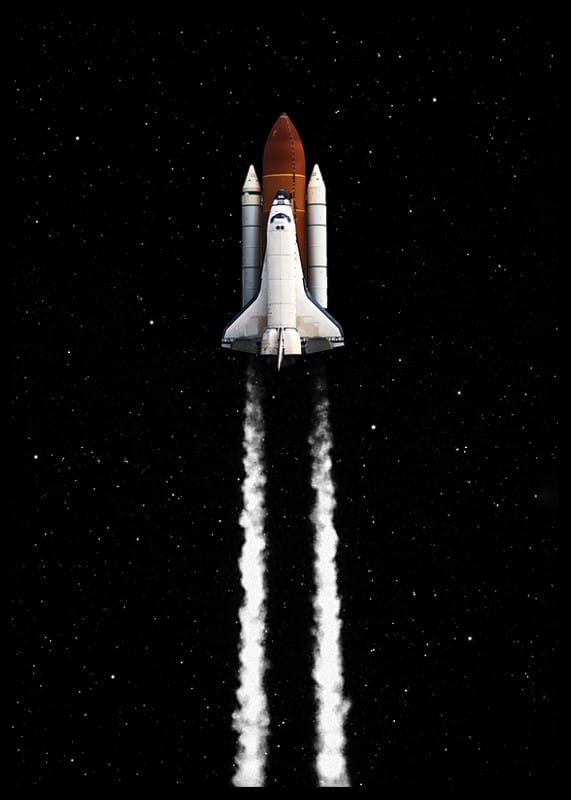 A space rocket in white and orange is seen lifting straight up through a black universe with scattered stars. Clear clouds of smoke extend downwards and create movement in the motif. The stylish composition gives the poster a modern expression and arouses curiosity in both children and adults. Fits well in children's rooms or creative environments.
