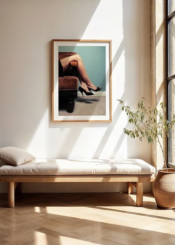 Legs in black high heels rest casually on the edge of a brown velvet sofa. The motif is photographed against a light blue wall and beige carpet, with a vintage feel in both style and color choice. This poster is perfect as a modern accent in a living room, hallway or spaces with retro-inspired decor.