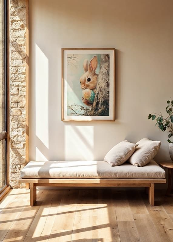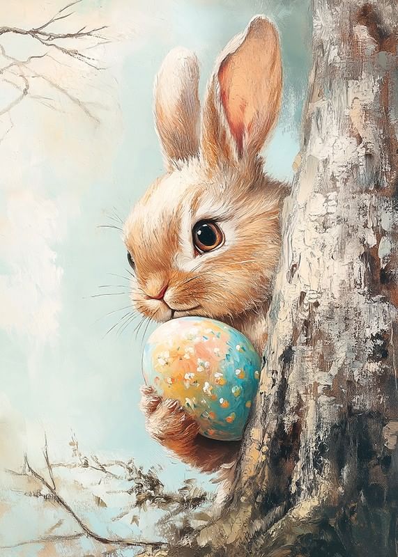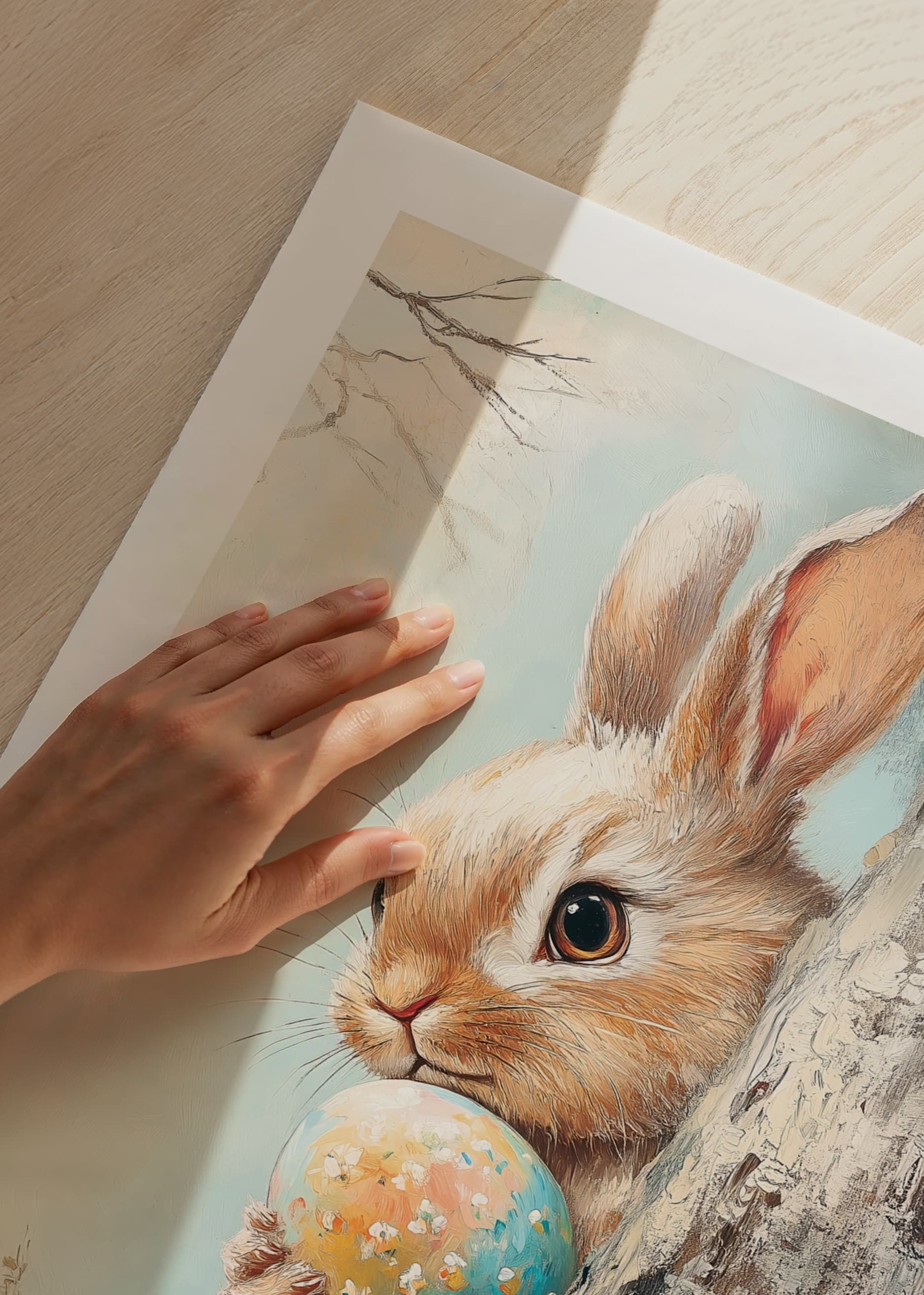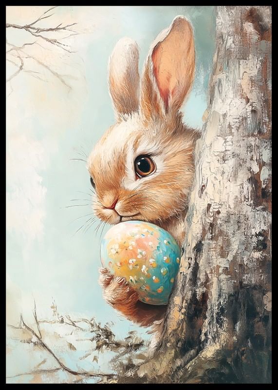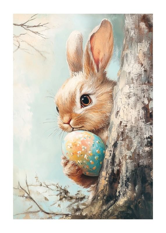 A brown rabbit with big eyes peeks out from behind a tree and gently holds a blue Easter egg decorated with small flowers. Soft pastel tones and a bright spring background create a friendly expression. This poster gives an Easter feel and fits nicely in a children's room or living room with a seasonal theme.