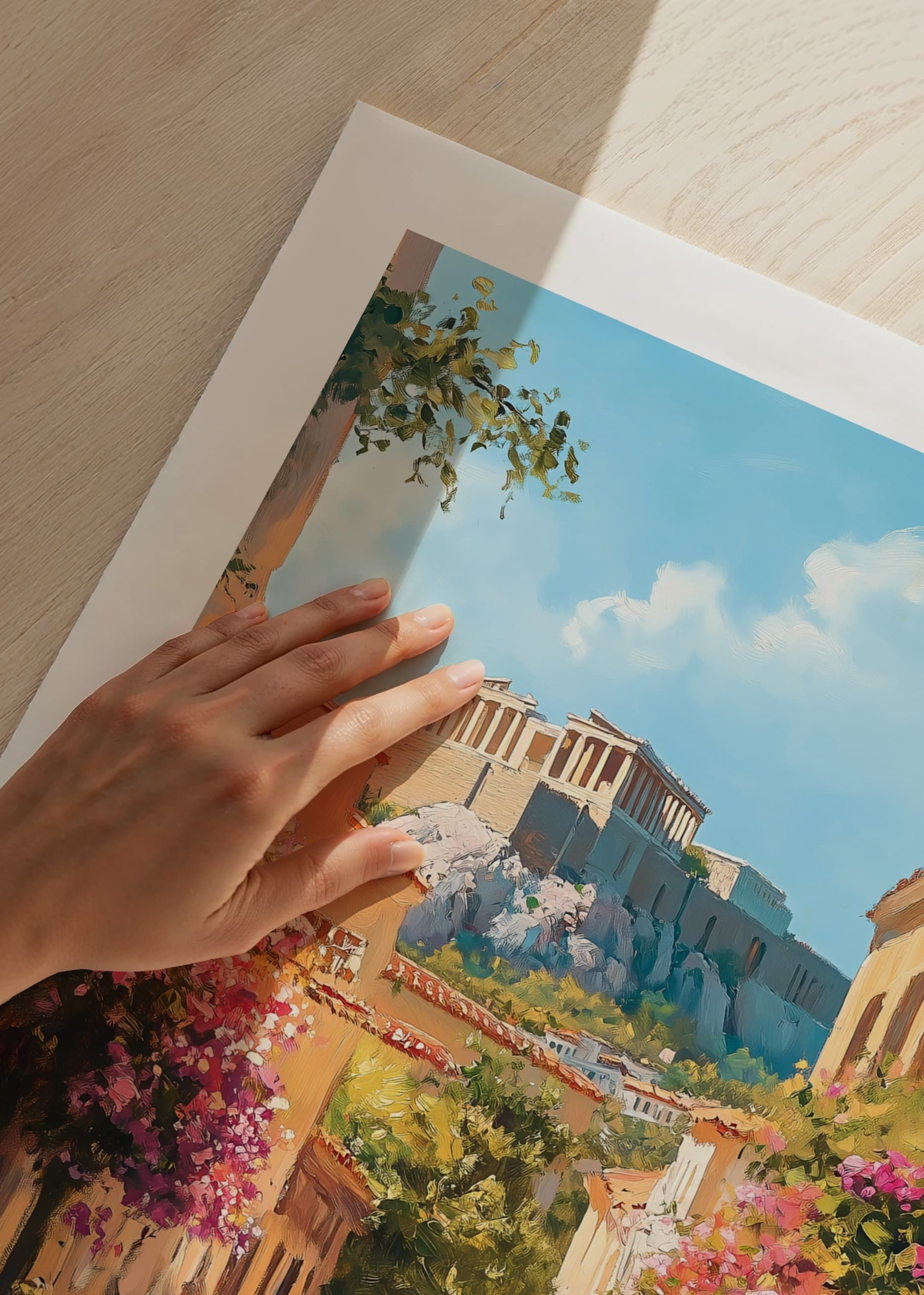 Narrow cobblestone alleys with light stone houses and lush flower arrangements in shades of pink and purple lead the eye towards the Acropolis temple on a hill in the distance. The sunny color palette and detailed brushstrokes give the poster an authentic Mediterranean feel. Suitable for a living room or hallway.