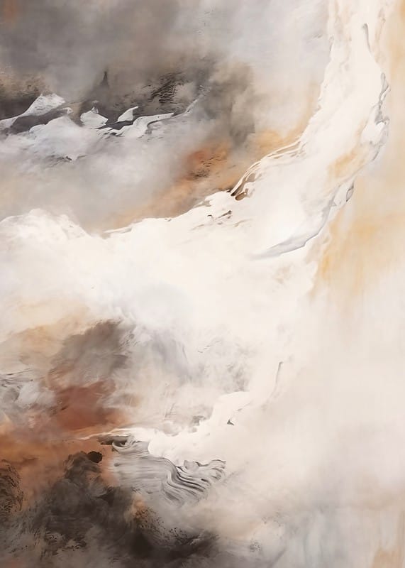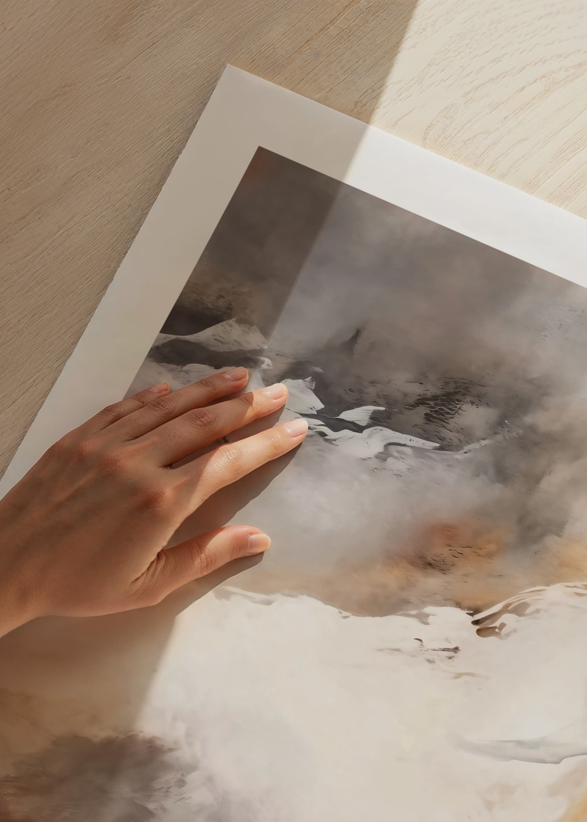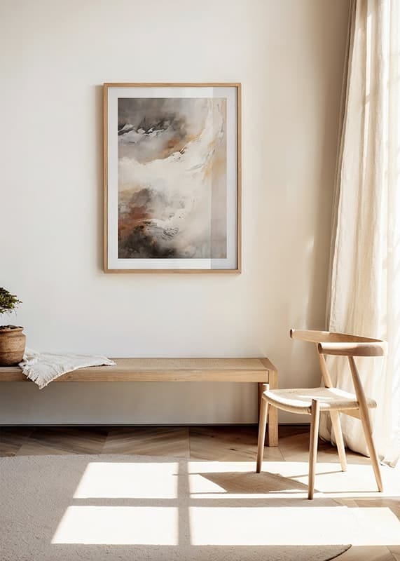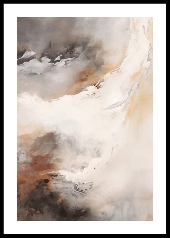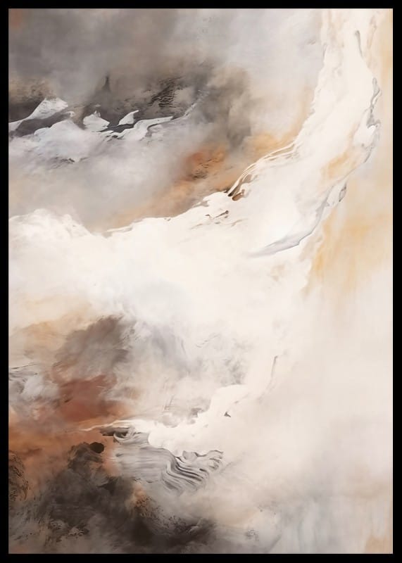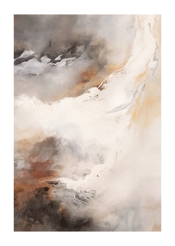 Soft color transitions in beige, brown, white and gray form a sweeping abstract motif with both light and dark areas. Irregular shapes and layers create depth in the image. With its harmonious expression, the poster gives a modern and minimalist feel to, for example, a living room, bedroom or hallway.