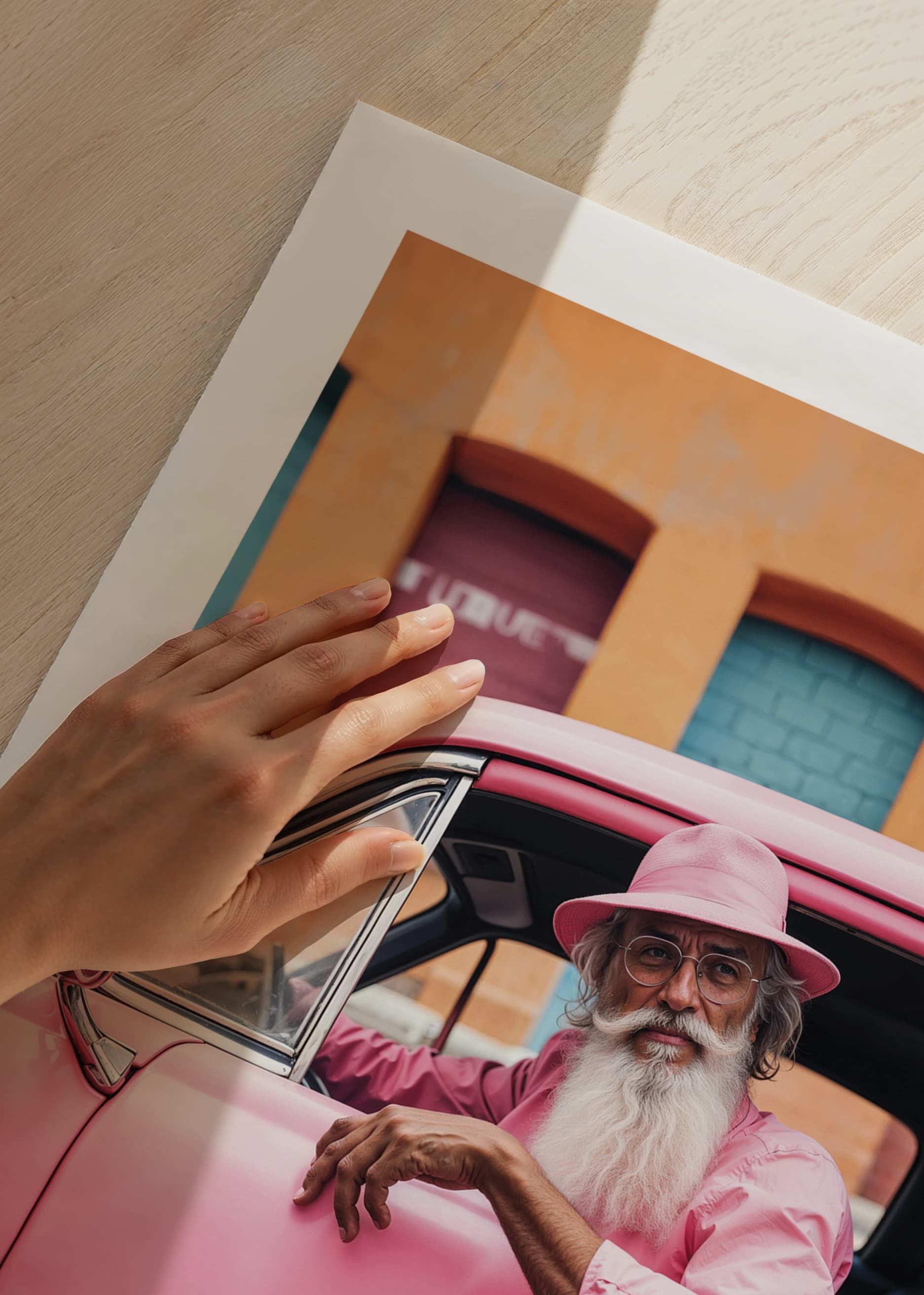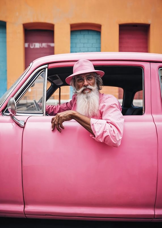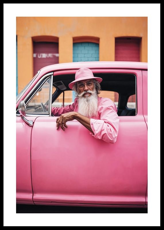 An older man with a white beard and pink shirt sits relaxed in a classic pink car, matching his hat and surroundings. The background consists of a lively facade in orange and pastel colors, which gives the motif a playful and colorful feel. This poster will be an expressive element in modern and creative environments.