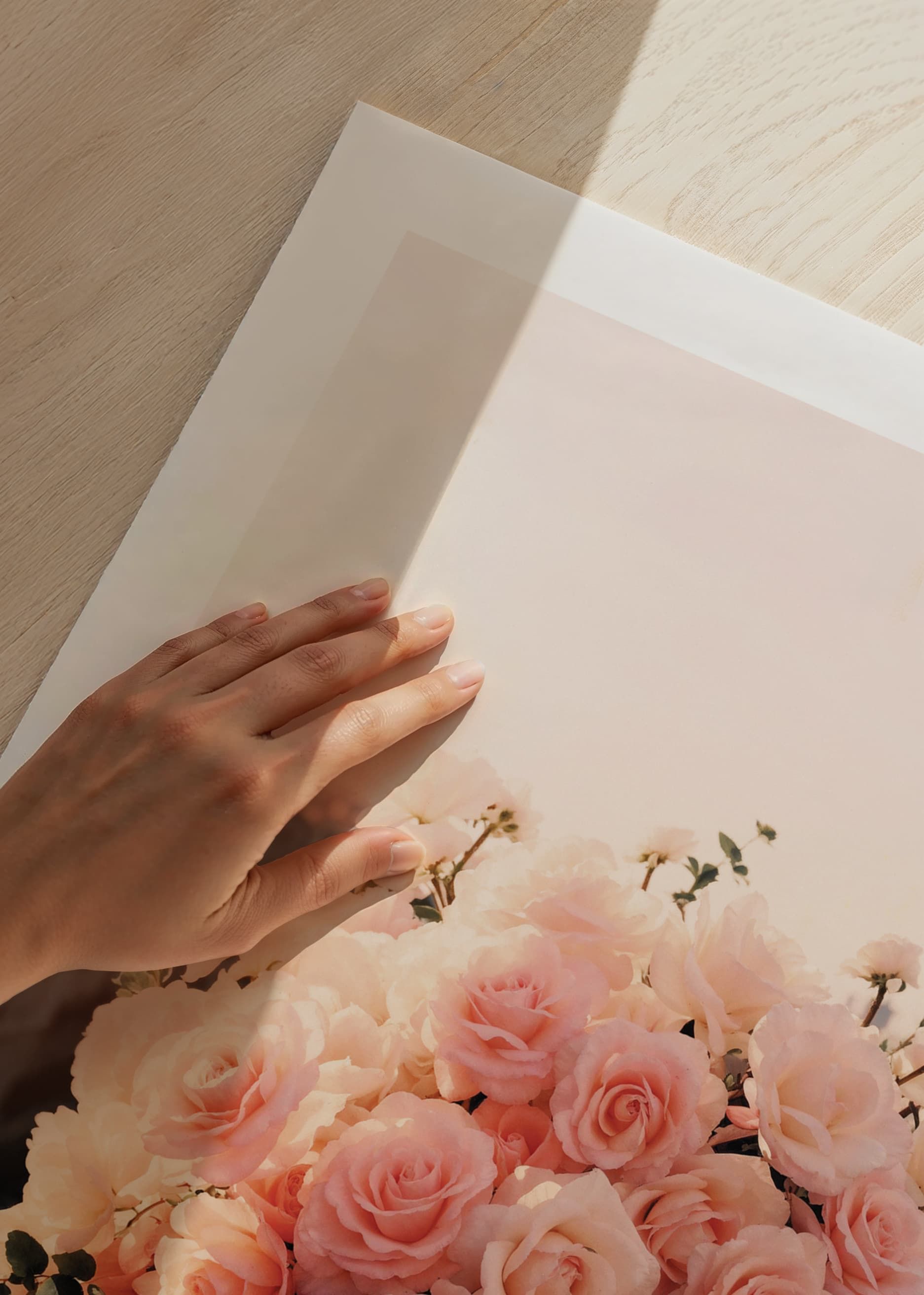A collection of pale pink roses arranged in a lush bouquet rests on a stone railing overlooking a city in soft evening light. The dense flower heads have touches of creamy white, surrounded by green leaves. The light gives the motif a warm feel and makes the poster look equally beautiful in both the living room and bedroom.