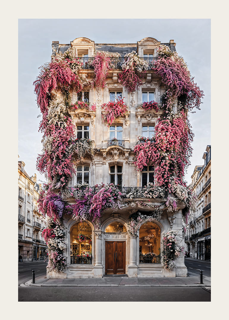 A grand city apartment with classic details is covered in abundant floral arrangements in pink, purple and white. The flowers climb along the facade and frame the windows and balconies with generous shapes. This poster provides a vibrant and charming detail, especially in the living room or hallway, and celebrates the architectural beauty of the city.