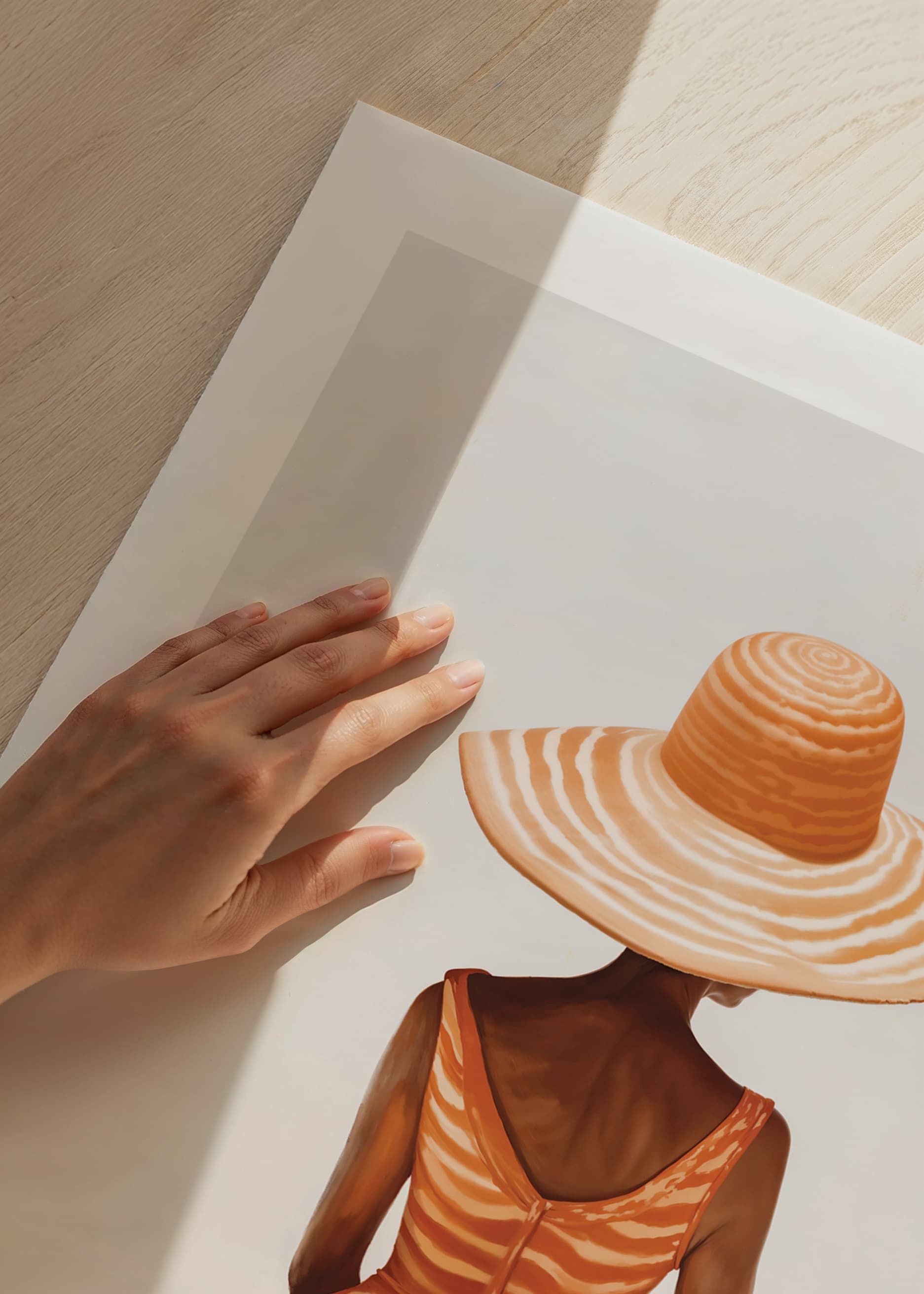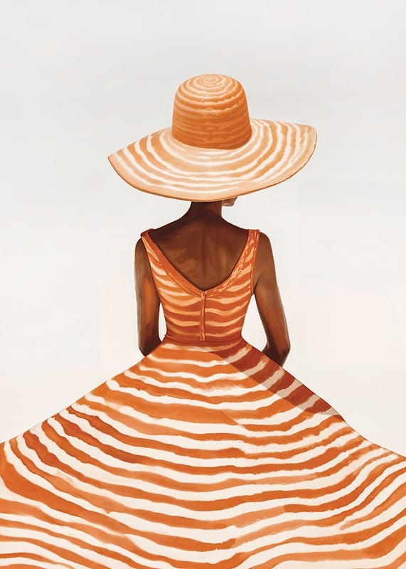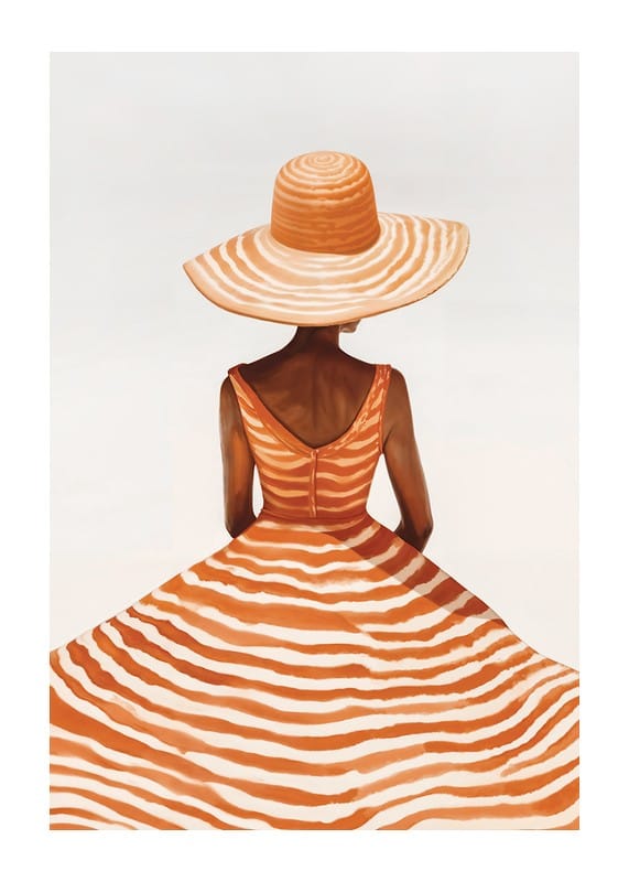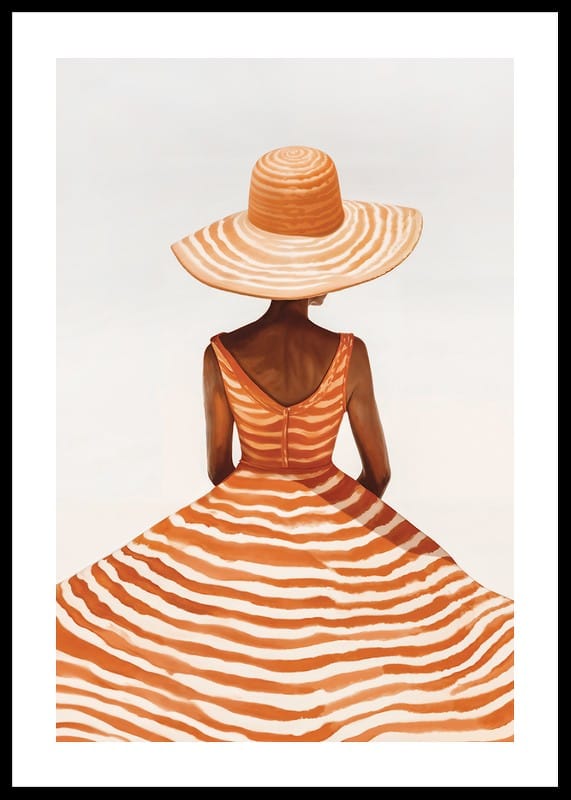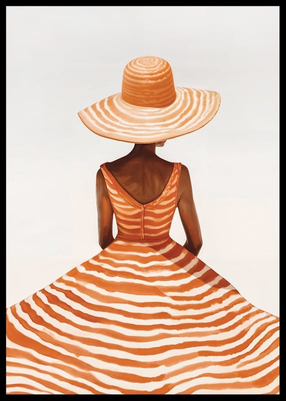 Poster with a painting of a woman seen from behind wearing a wide-brimmed hat and a dress with orange and white stripes, against a diffused background. Her pose and the flowing lines of the dress give a sense of elegance and summer breeze.