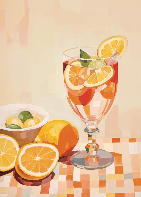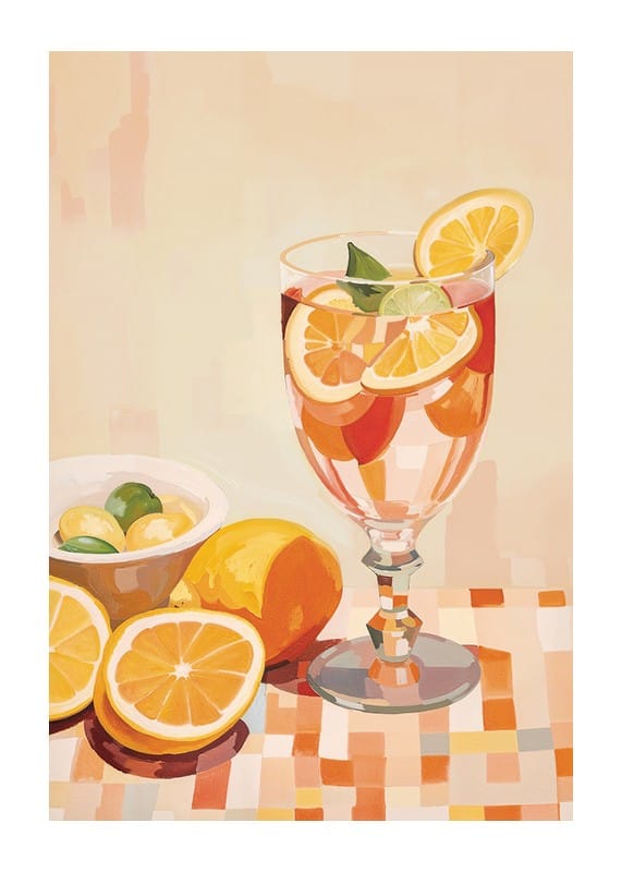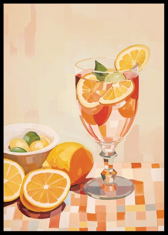 Poster from the abstract category with a painting of a drink with orange slices on a checkered tablecloth. The painting has a vintage style and gives a refreshing and summery feeling.