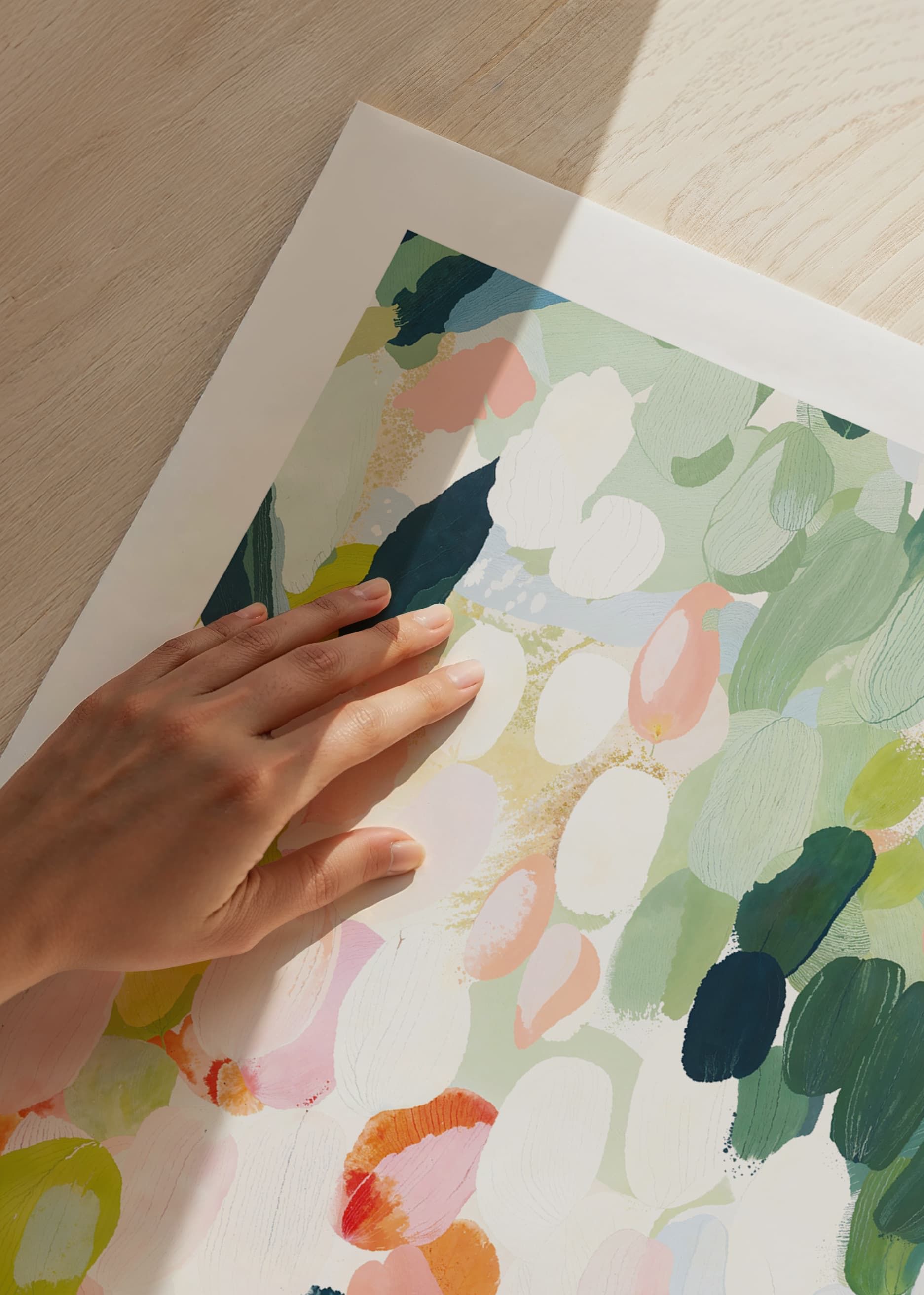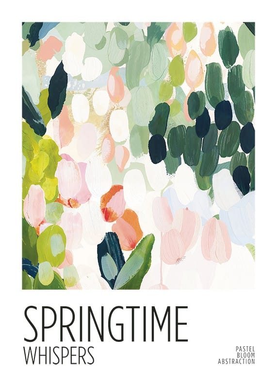 Poster featuring an abstract watercolor painting titled 'Springtime Whispers', depicting a collection of blooming flowers in a soft and pastel palette. The painting presents a light and airy motif that seems to symbolize the arrival of spring with its exuberant green, pink, white, and yellow tones. The brush strokes of the leaves and flowers are loosely and expressively applied, giving the work a dreamlike and impressionistic feel.
