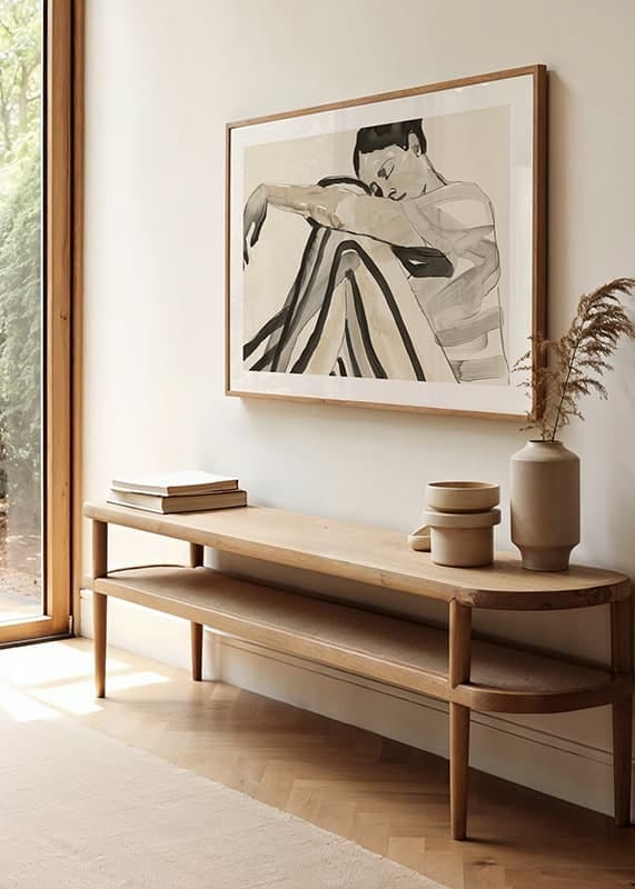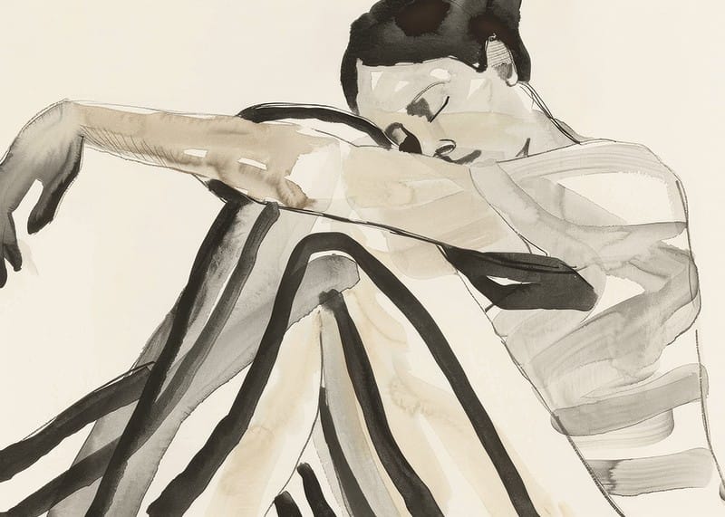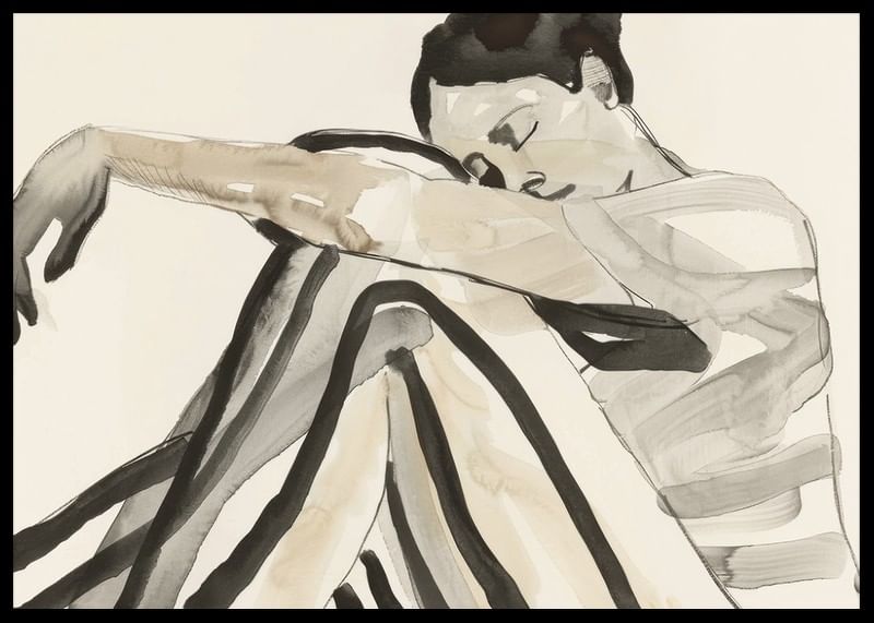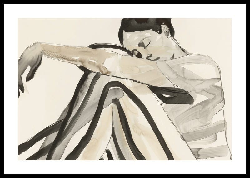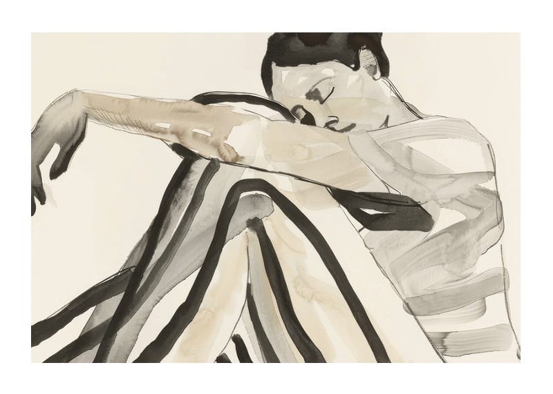 Poster with a watercolor painting of a young woman in striped clothes and a relaxed pose. The image expresses a feeling of thoughtfulness and calm.