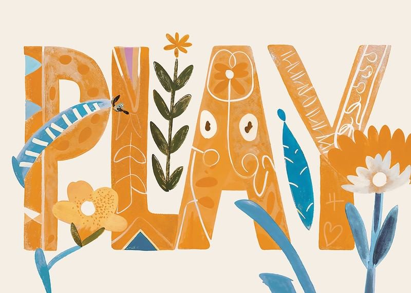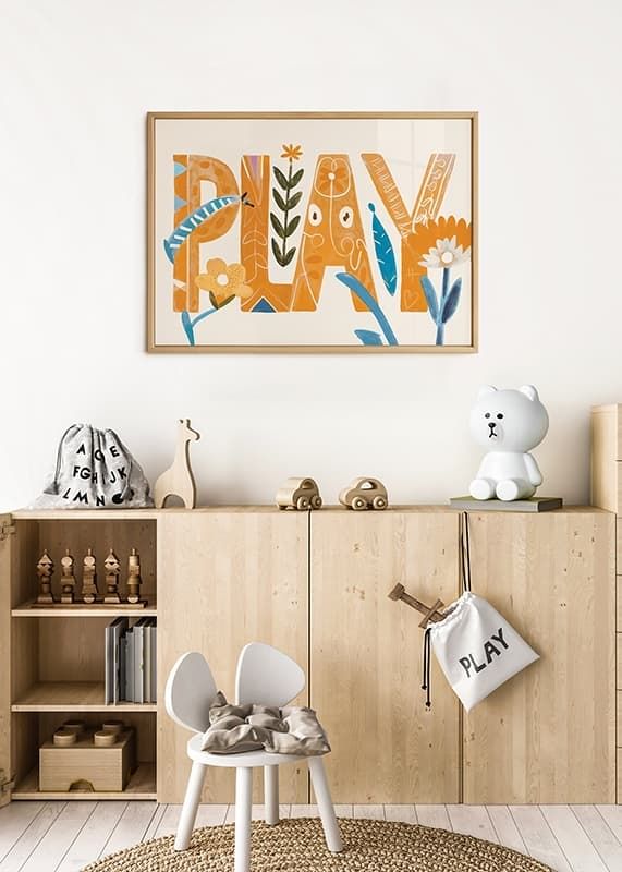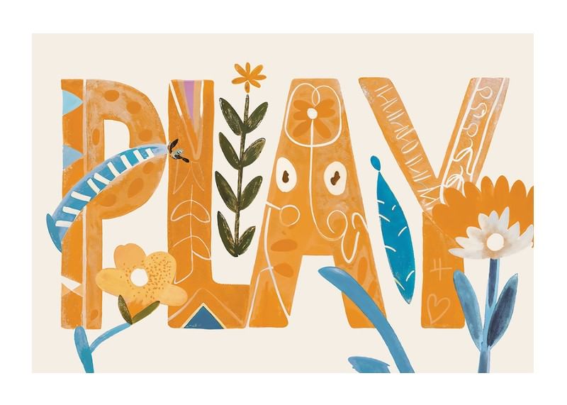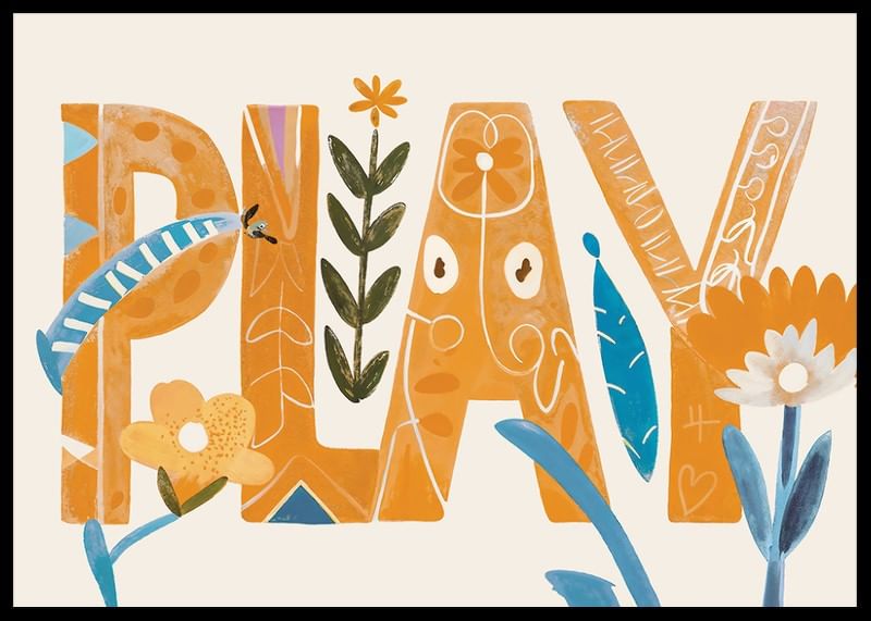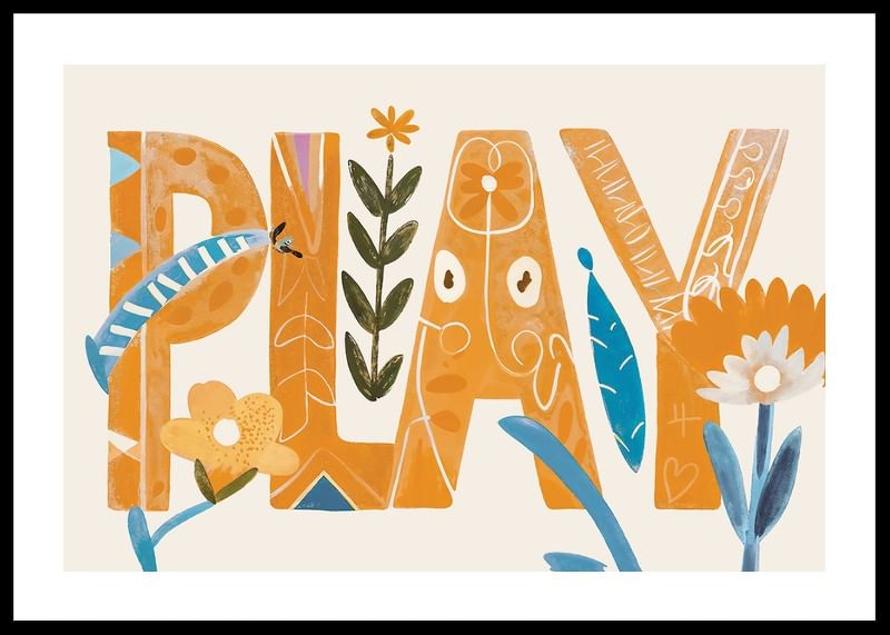 Poster featuring a watercolor painting with artistically shaped letters that vibrantly interact with flowers and foliage, creating a unique botanical typography with the order 'PLAY'. Each character is carefully decorated with nature-inspired motifs, which together depict the beauty of the alphabet with playfulness.