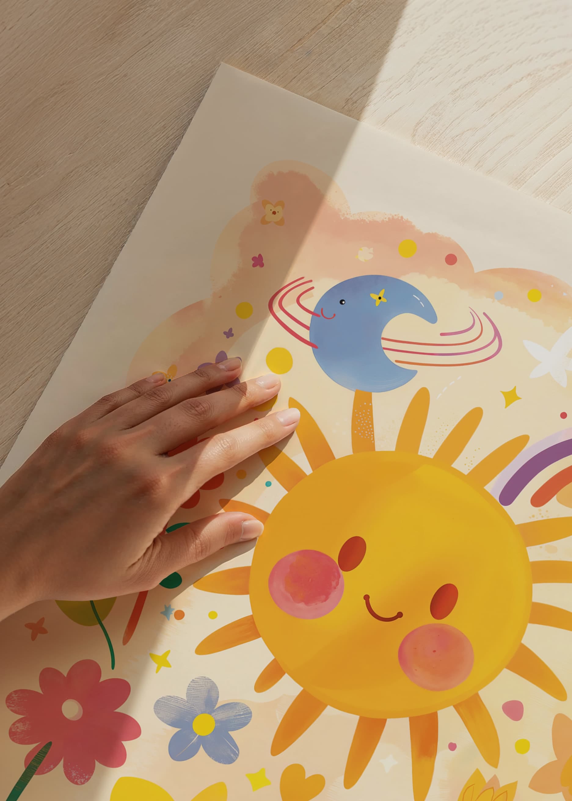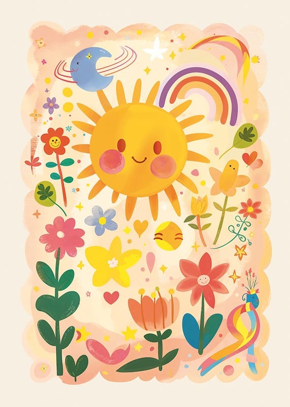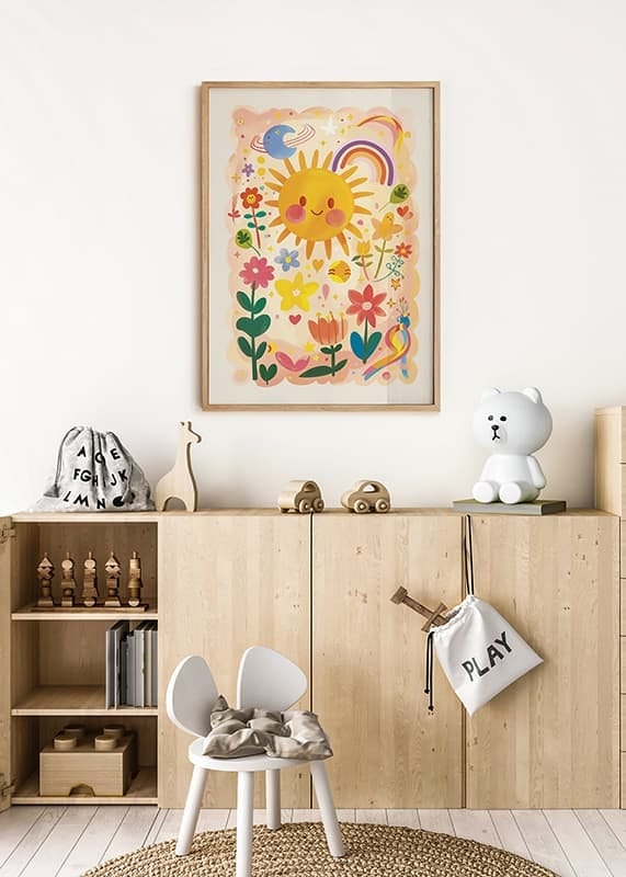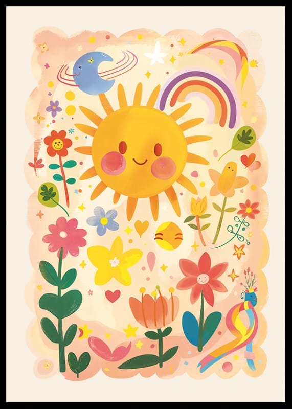 Poster with a playful watercolor painting that radiates joy with its depiction of a smiling sun, colorful flowers and a charming rainbow. Its childlike charm and warm colors create a warm and welcoming atmosphere that can brighten up any room.
