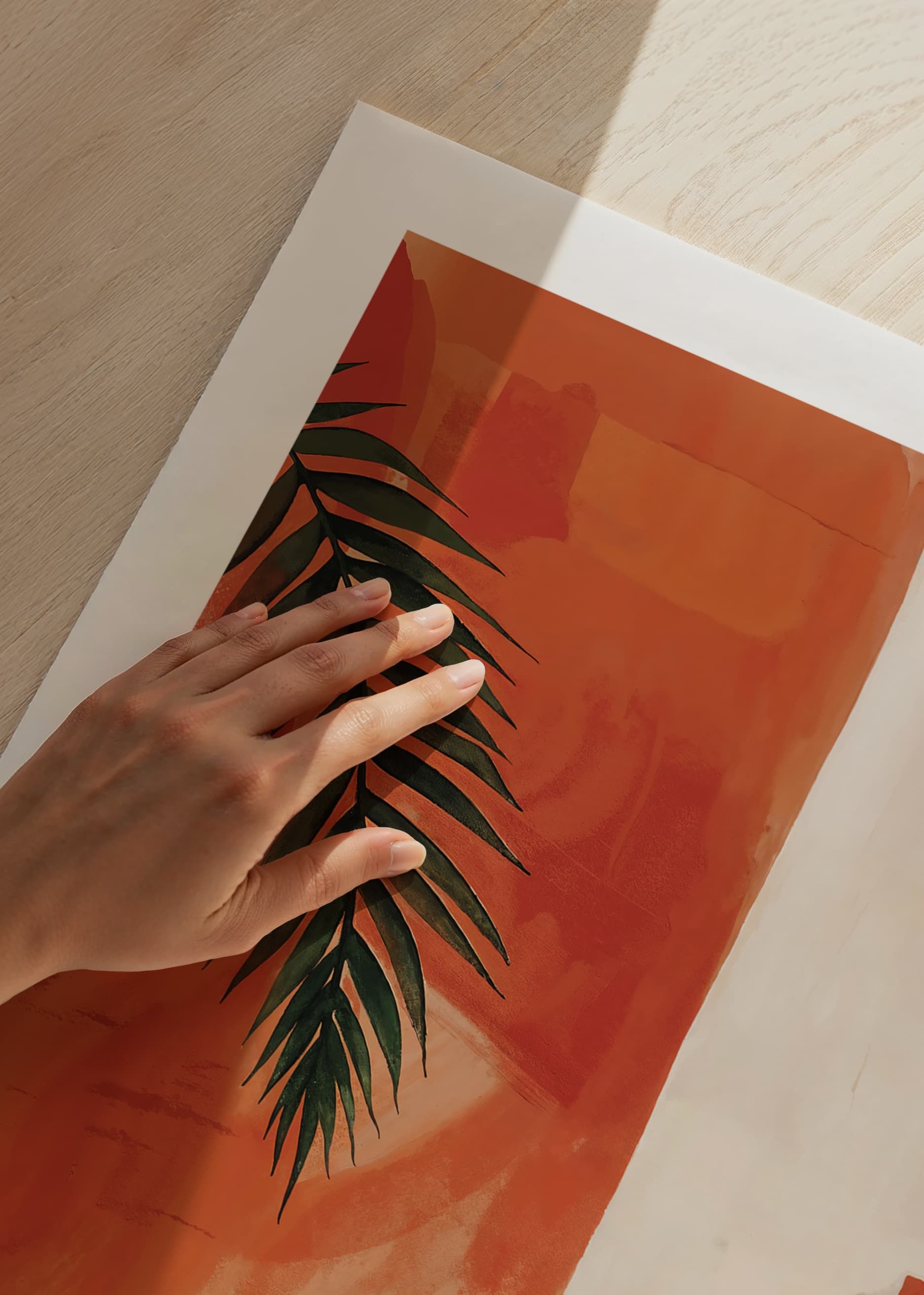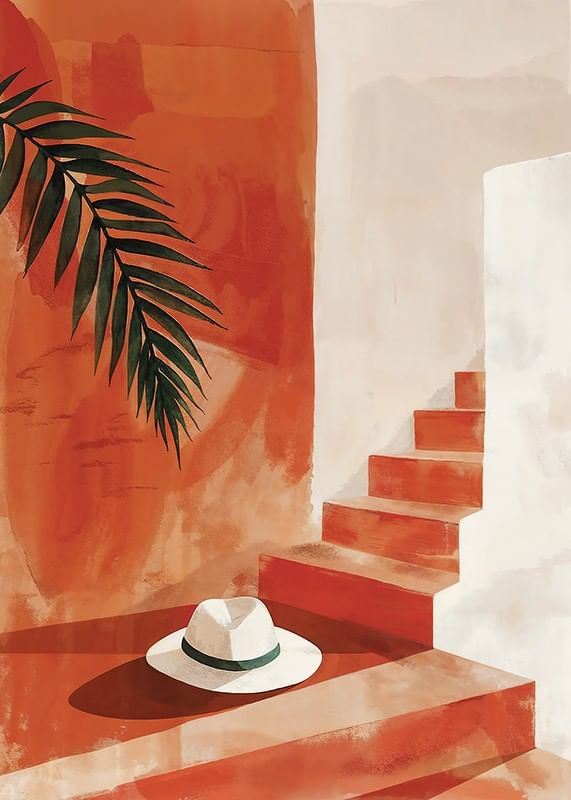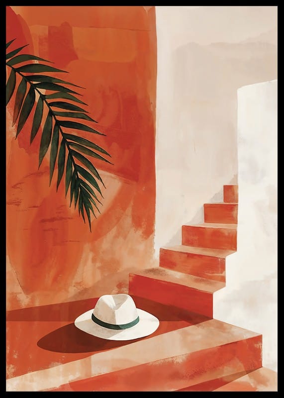 Poster featuring a watercolor painting depicting a relaxed afternoon in the shadow of terracotta colored walls, where a white hat rests peacefully on a warm stone staircase. The palm fronds create a play of shadows and bring the calm and sun-kissed scene to life.