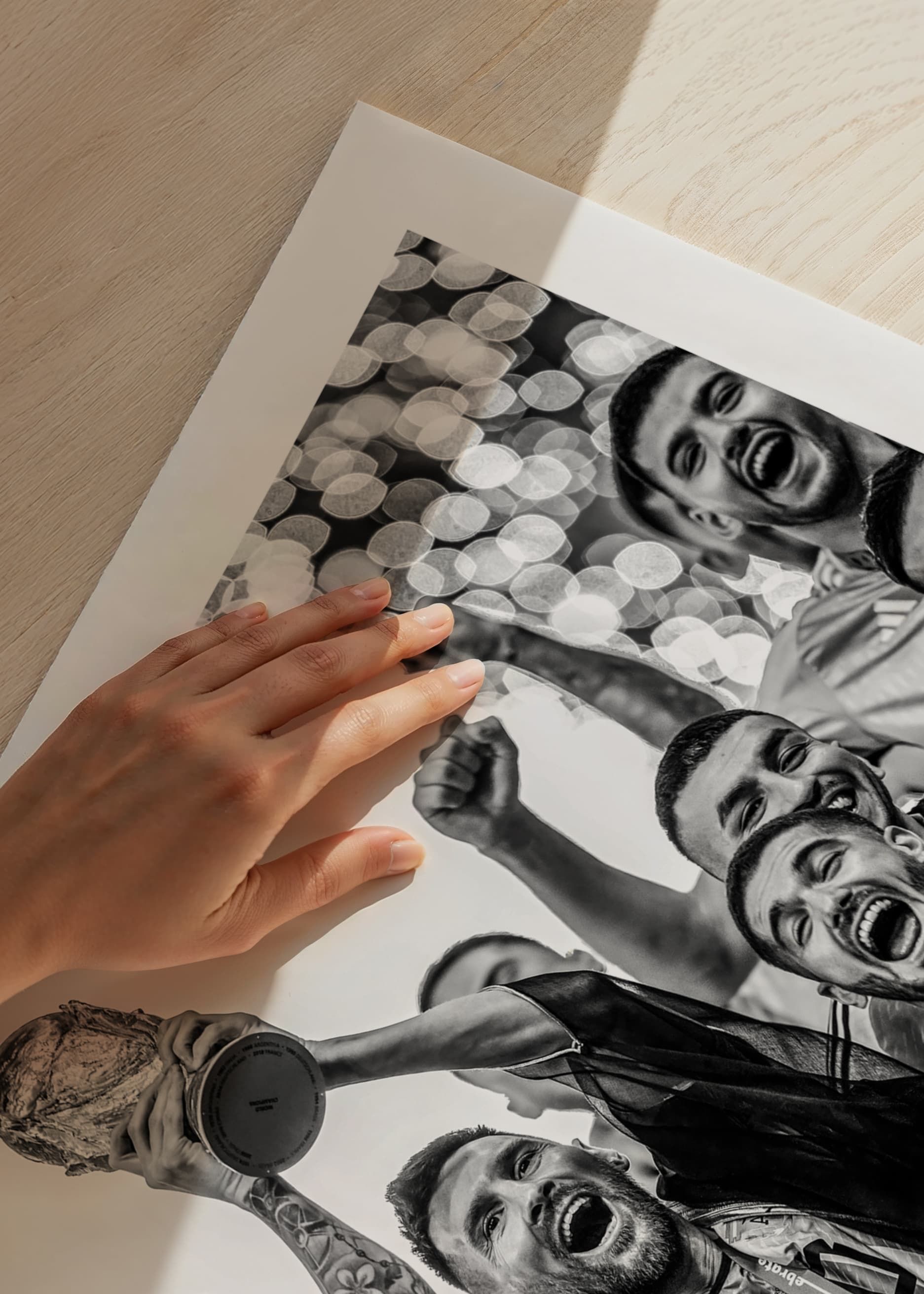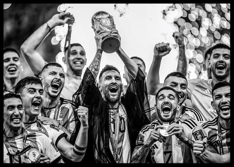 Black and white poster with a photograph of Lionel Messi with Argentina lifting the victory trophy and celebrating after winning against France in the final of the FIFA World Cup in Doha, Qatar, December 18, 2022.