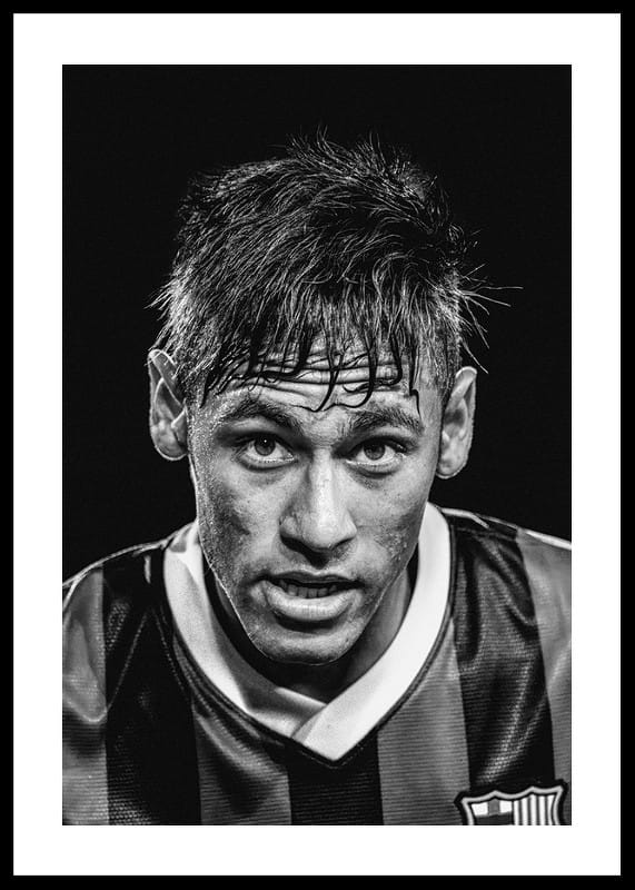 Black and white poster with a photograph of Brazilian football star Neymar Jr in FC Barcelona in 2013.