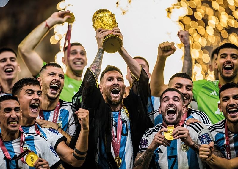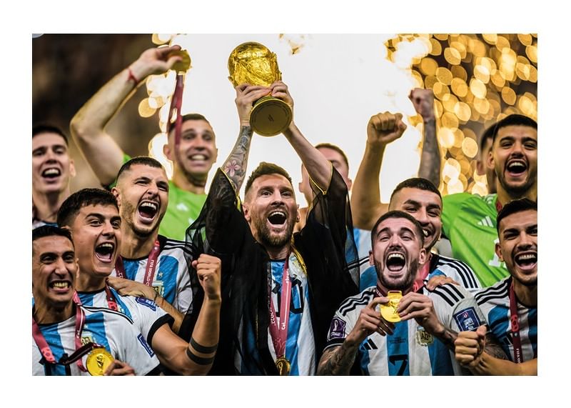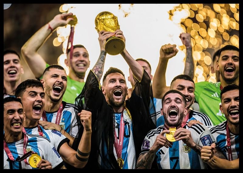 Poster with a photograph of Lionel Messi with Argentina lifting the trophy and celebrating after winning against France in the final of the FIFA World Cup in Doha, Qatar, December 18, 2022.