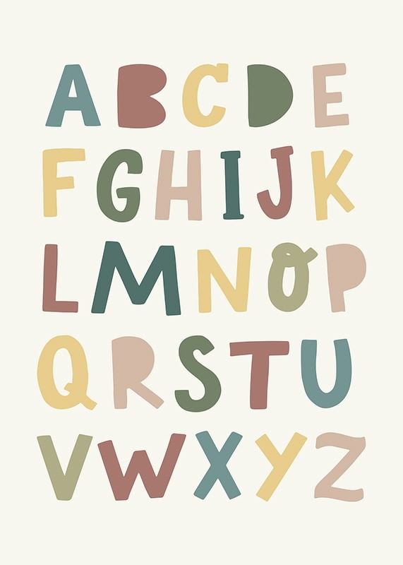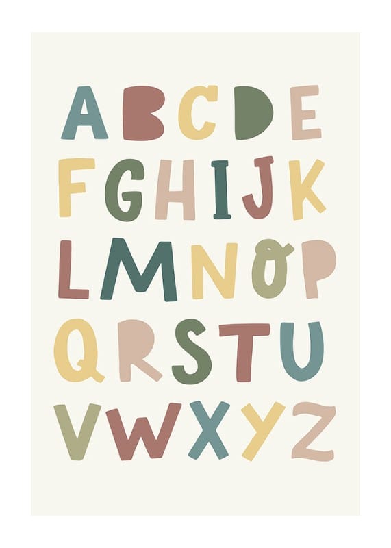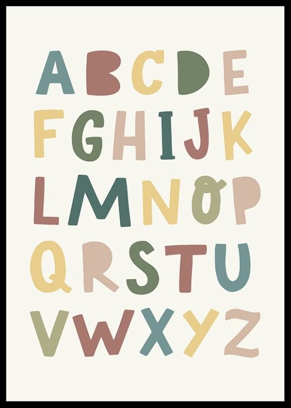 Transform the children's room with this colorful and educational poster. The playful design with the alphabet in soft, muted shades makes learning fun and visually appealing. Perfect for inspiring curiosity and creativity in your child every day.