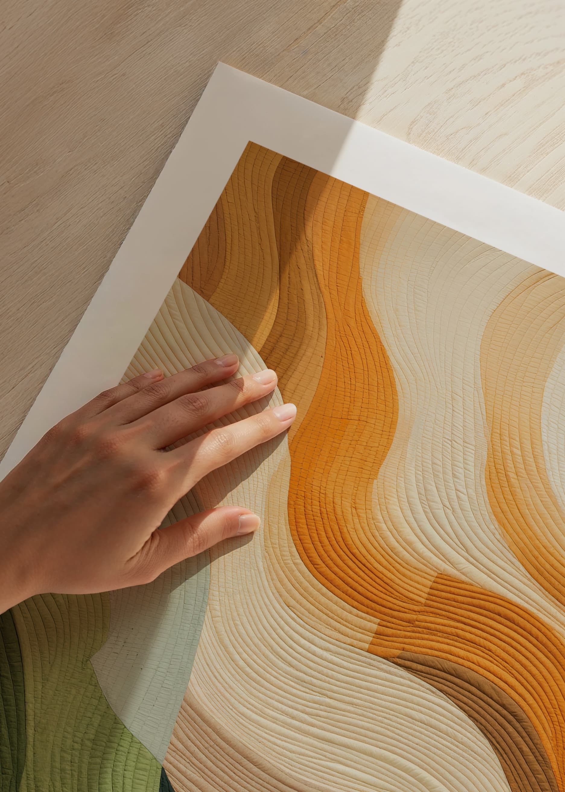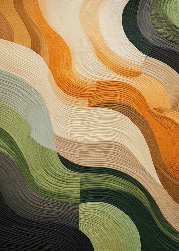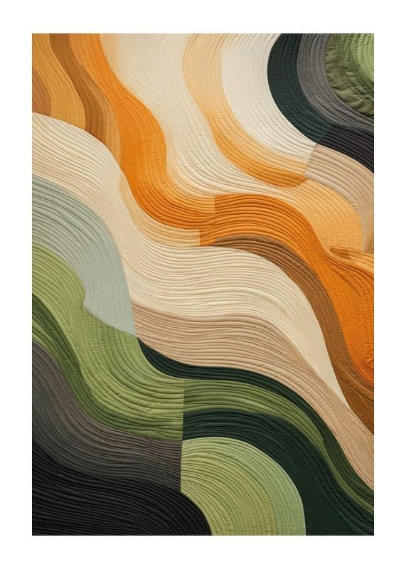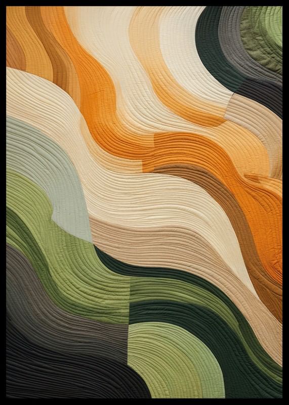 This poster features an abstract artwork with undulating, colorful lines in earthy tones of green, orange and beige. The soft, organic shapes create a sense of movement and harmony, perfect for adding a touch of modern elegance and creativity to your home.
