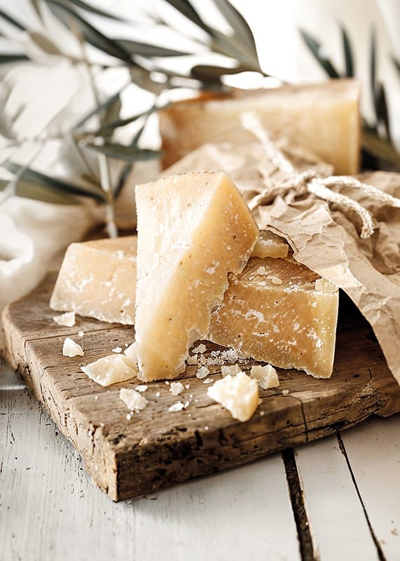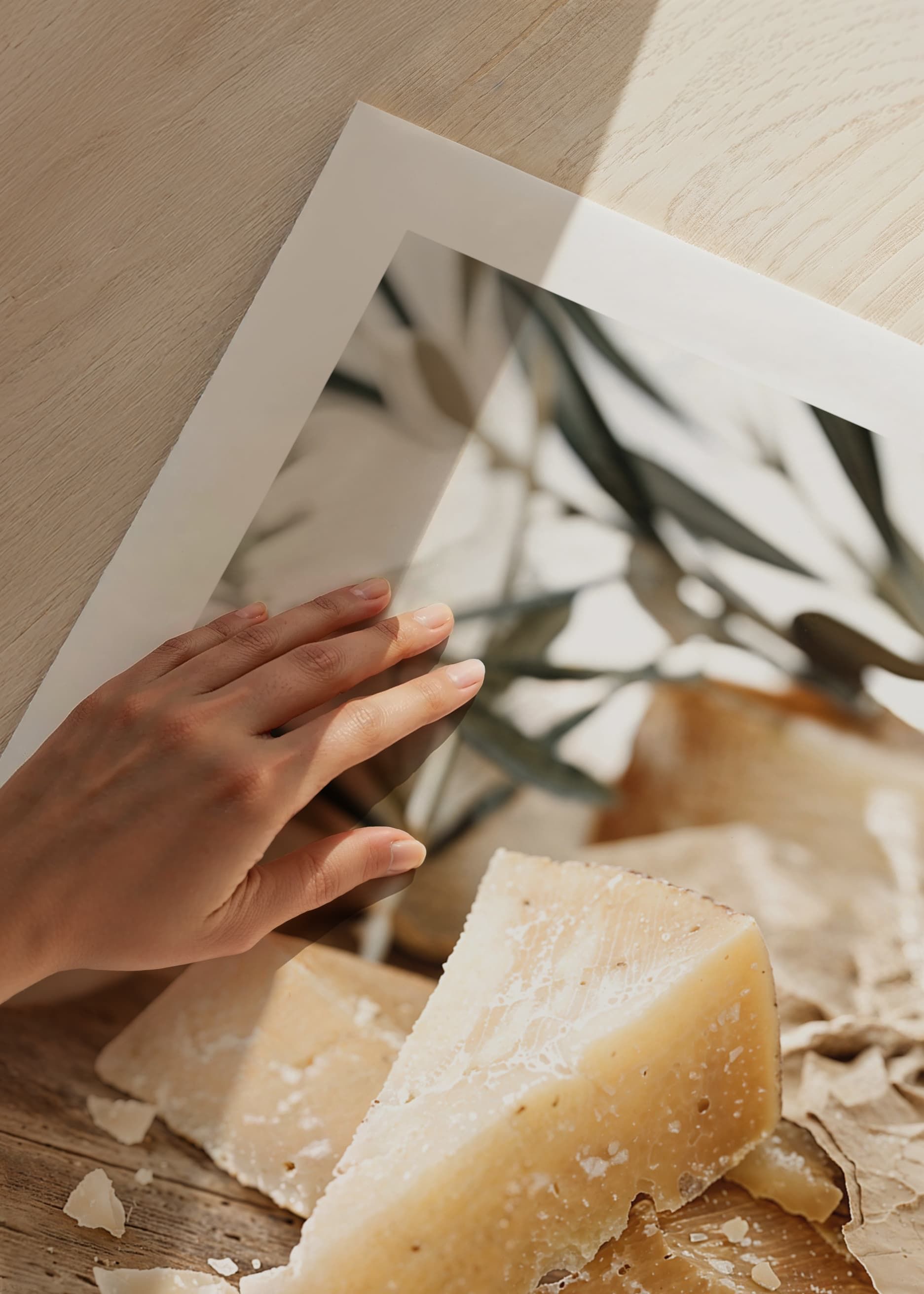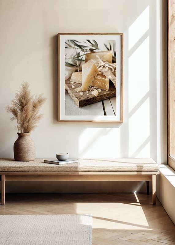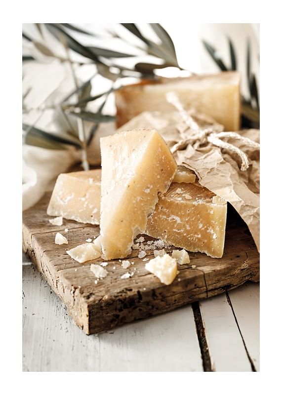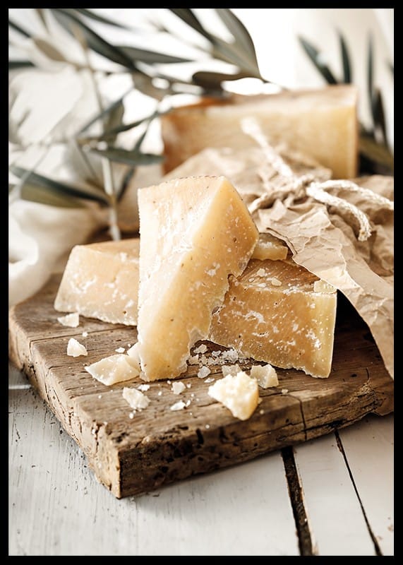 Elevate your kitchen with this beautiful poster that captures the rustic charm of aged Parmesan cheese. With its golden tones and crispy texture against a wooden board, the image creates an inviting atmosphere of culinary delight and authentic cooking. Perfect for all food lovers.